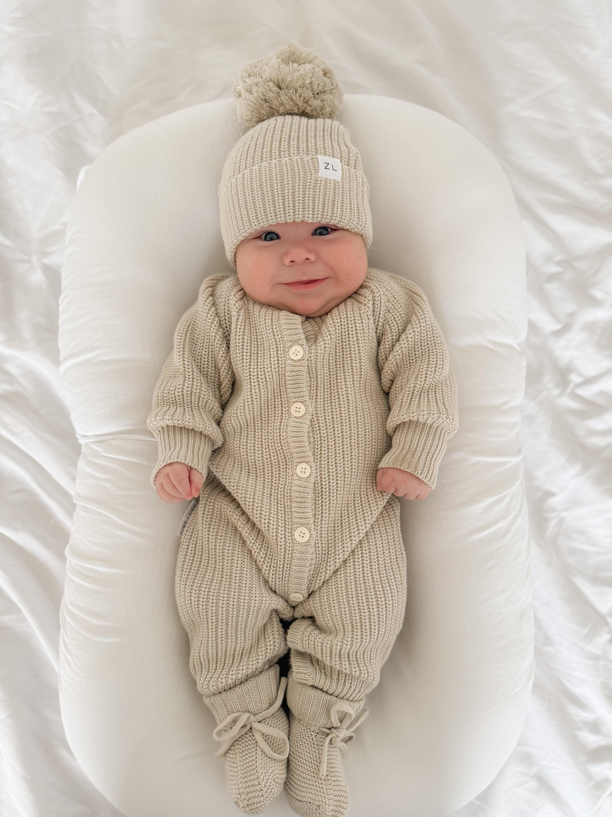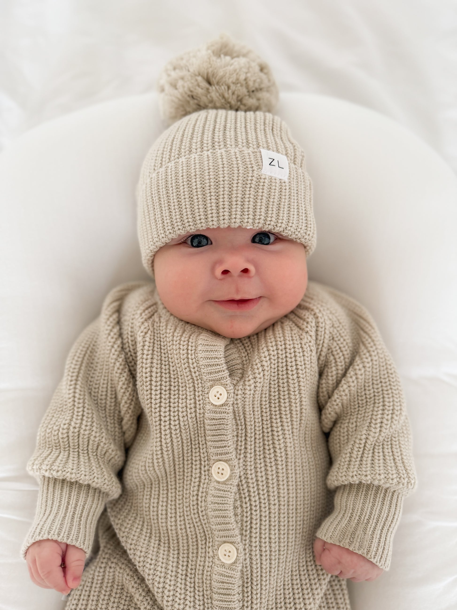 Beautiful chunky knit beanie to complement our moss knitted romper and booties.
