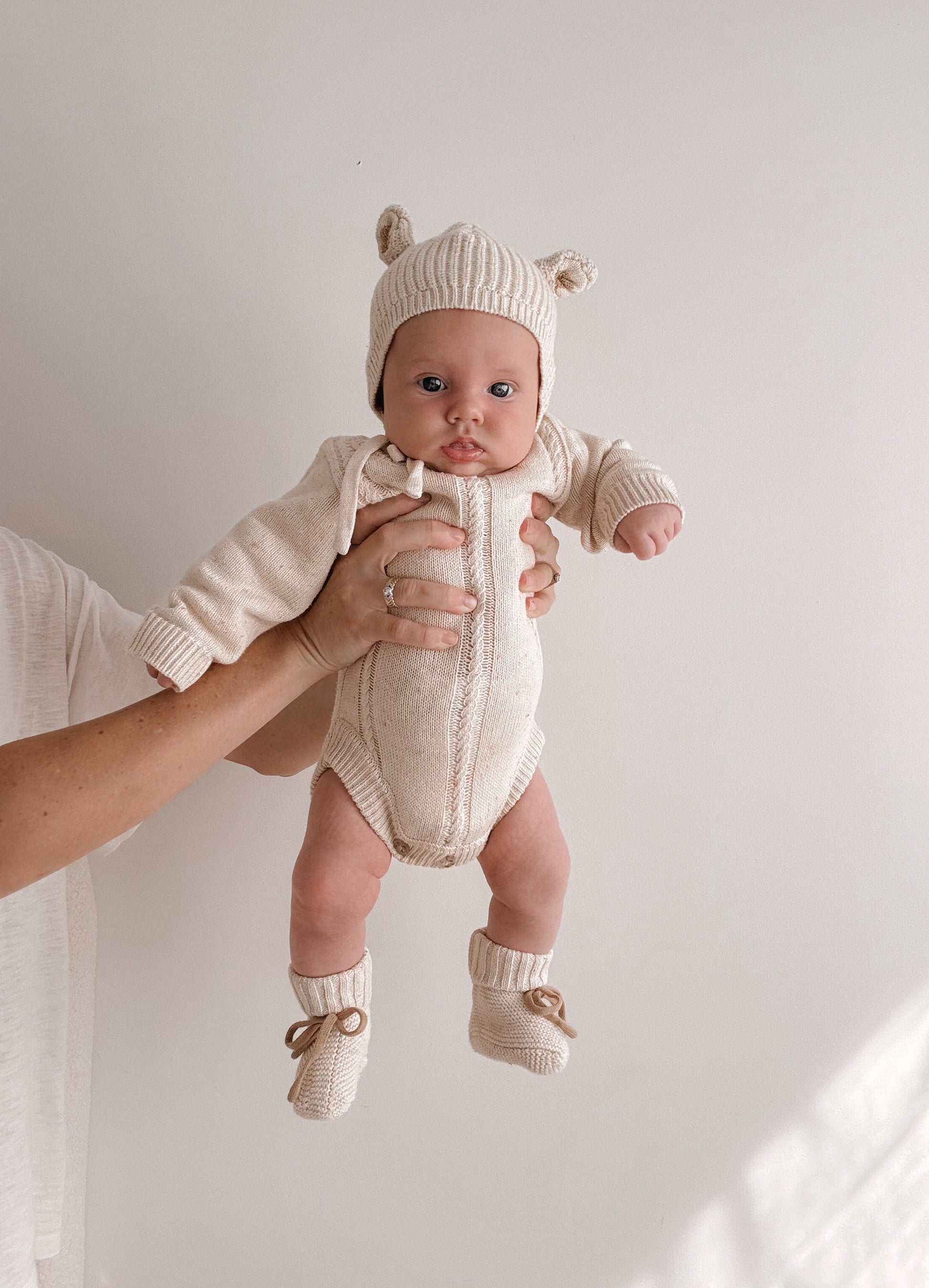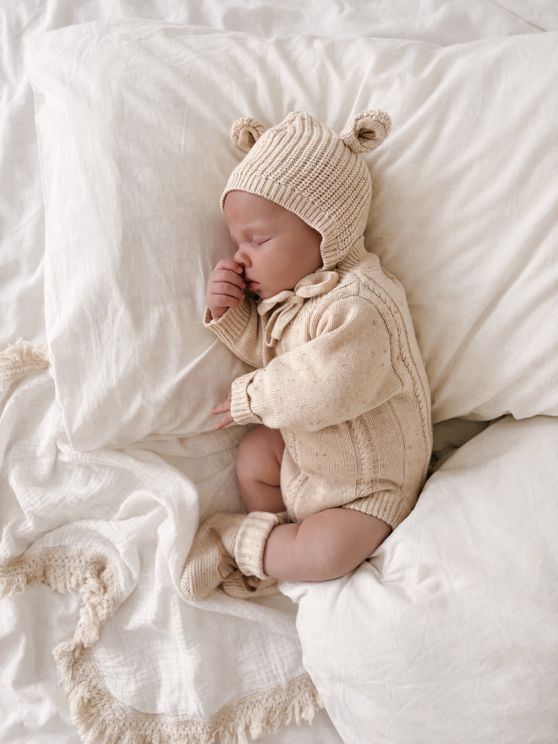 Beautiful chunky knit bonnet with adorable bear ears featuring a maple coloured inner ear. Match with items from our Biscotti Fleck Signatures Collection.