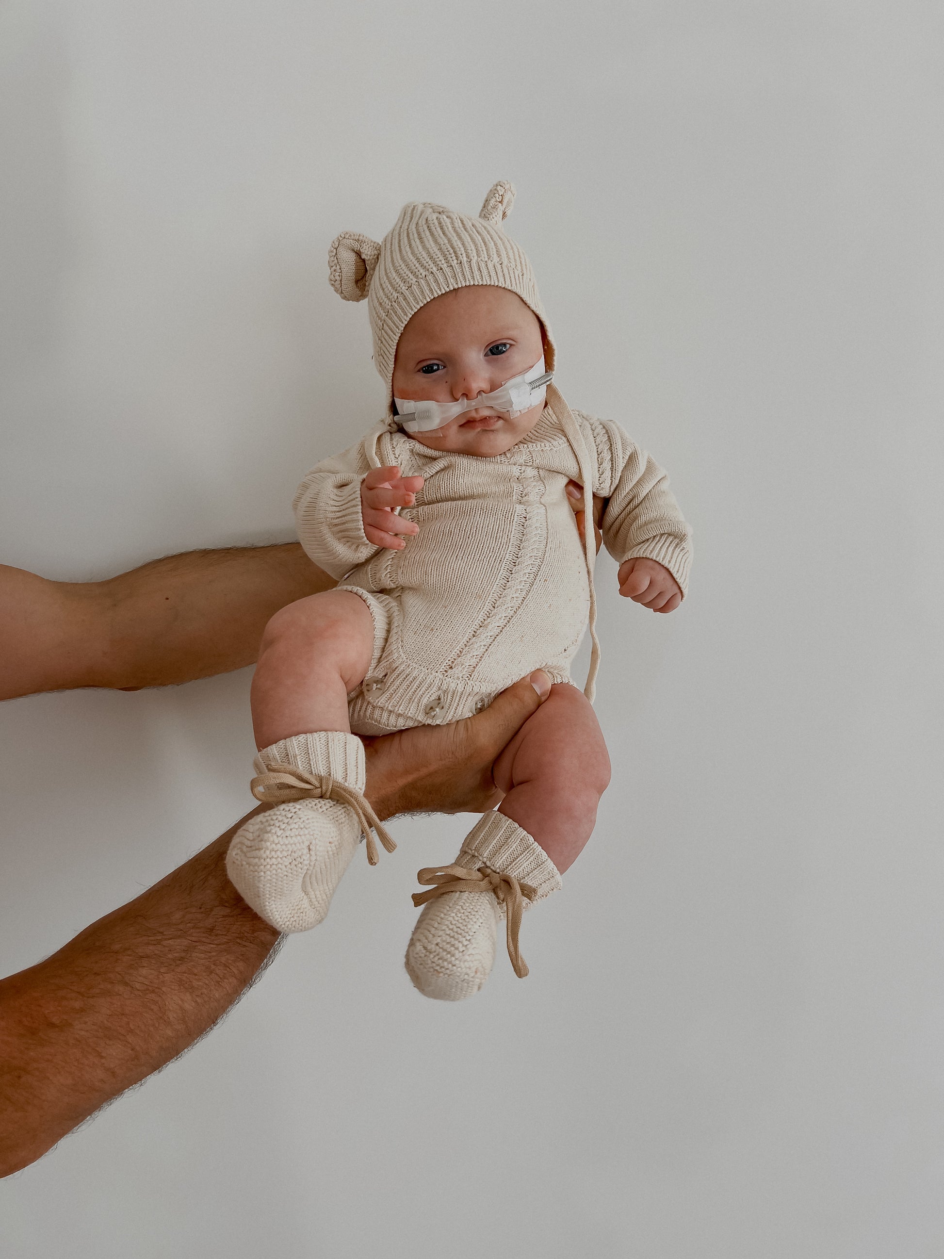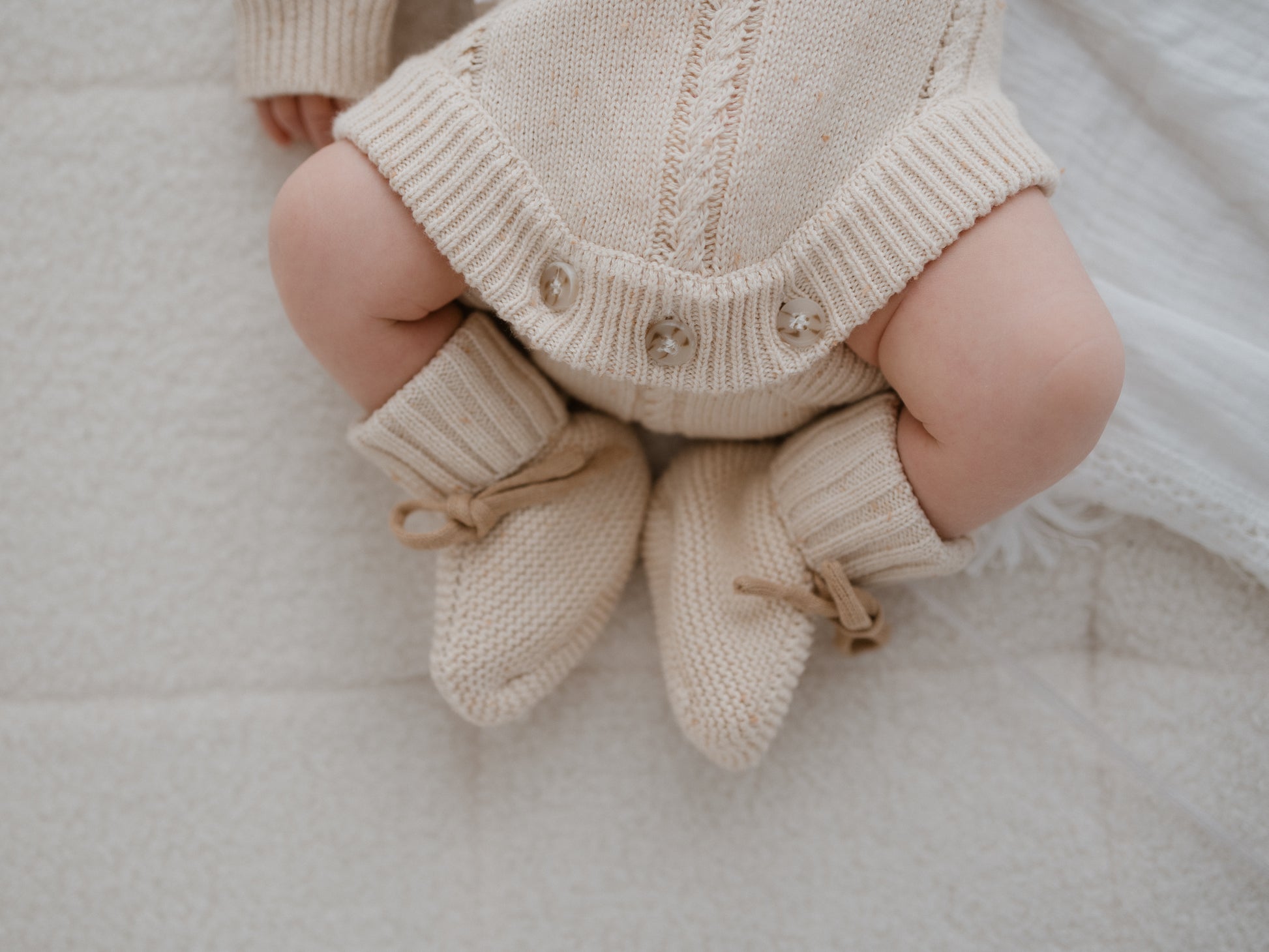 Knitted booties to compliment our knitted rompers, beanies & bonnets. Functional drawstring in Maple to ensure booties don't fall off when worn. Match with items from our Biscotti Fleck Signatures Collection.