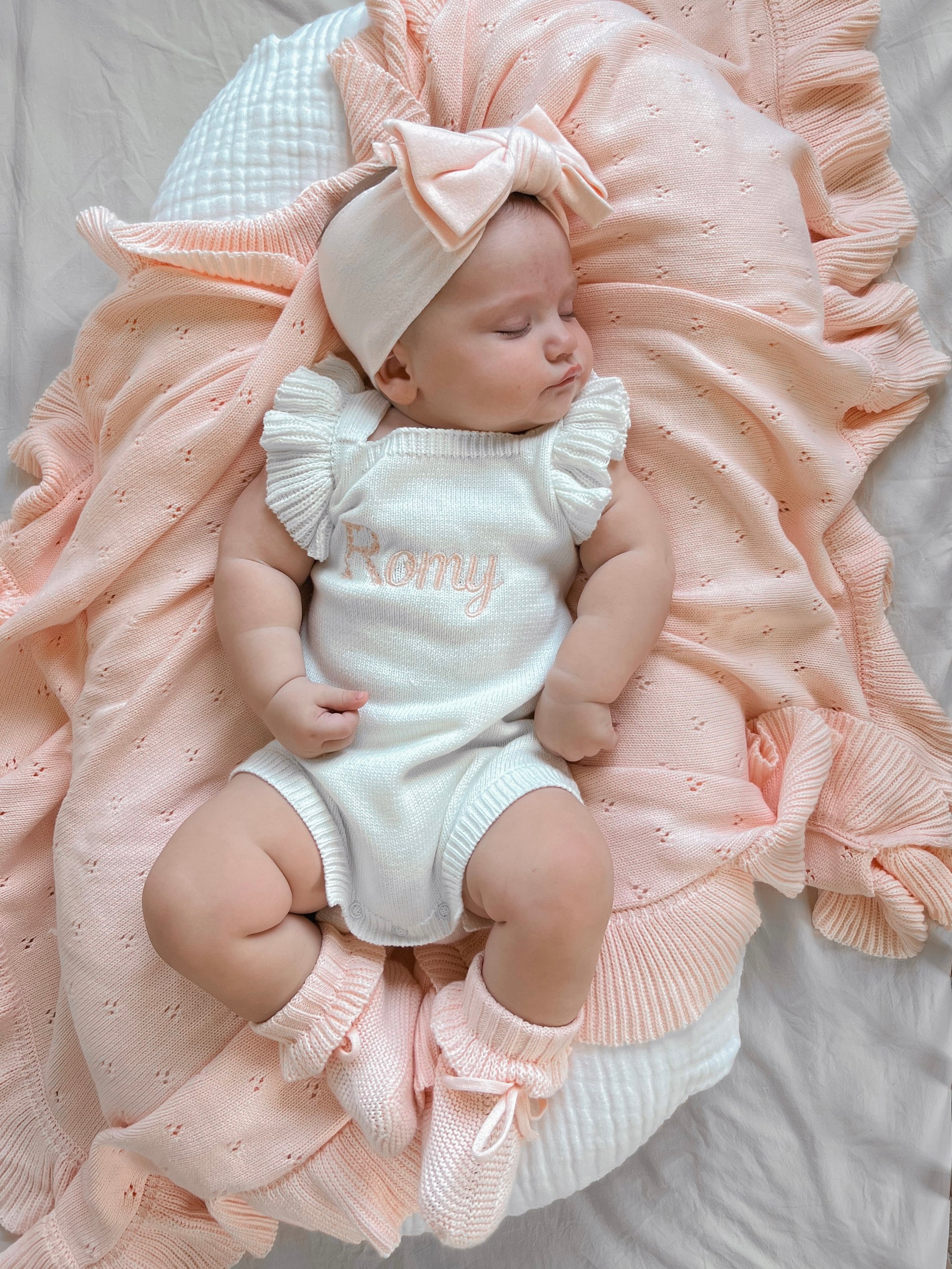 Knitted booties, with gorgeous frill detail and functional drawstring to ensure booties don't fall off when worn. Match with our Primrose Signatures Collection.