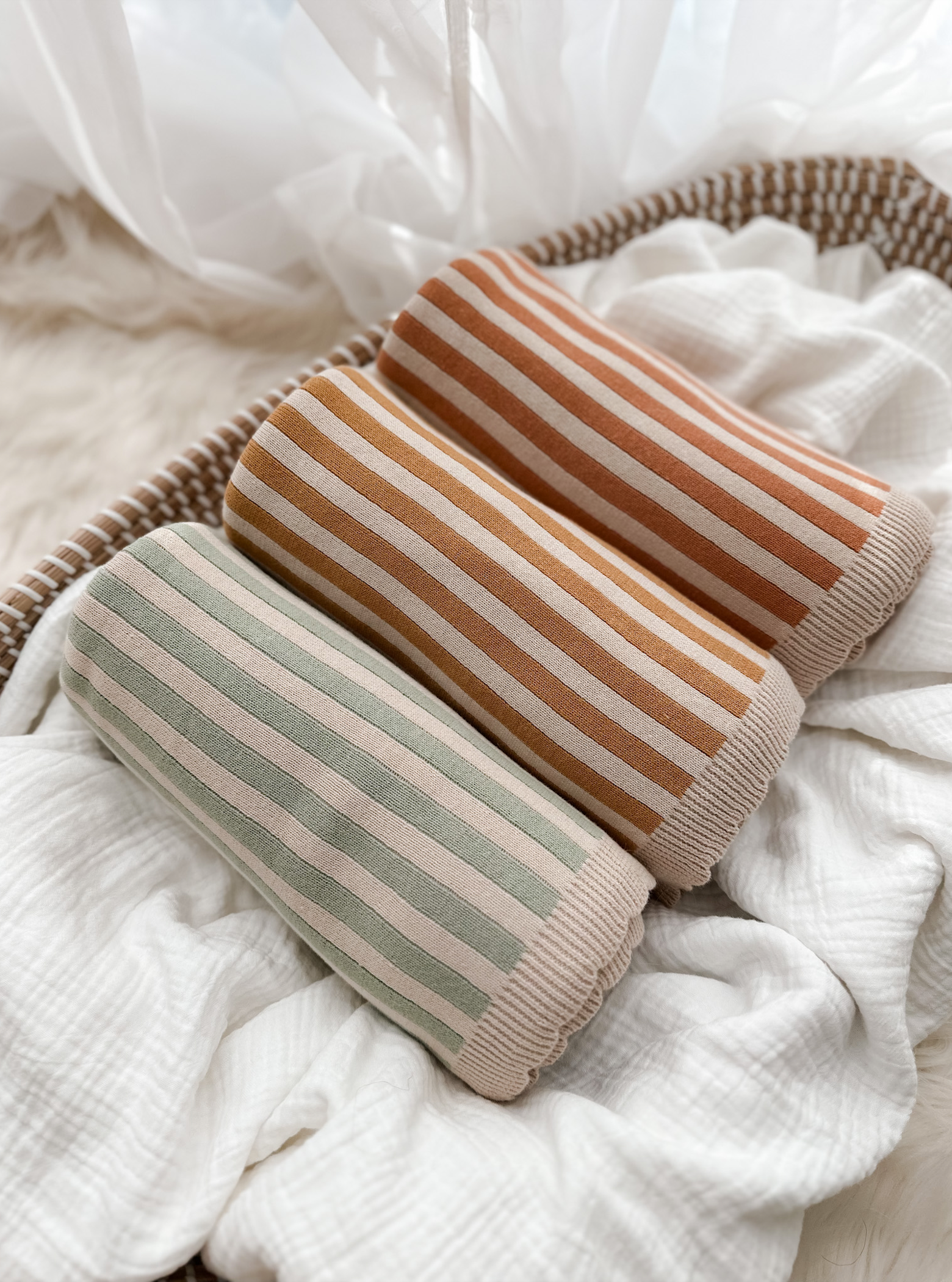 The most adorable, whimsical baby blankets. Crafted with 100% organic cotton, they feature a vintage striped pattern in three gorgeous colours, and are completed with an elegant scalloped trim.
