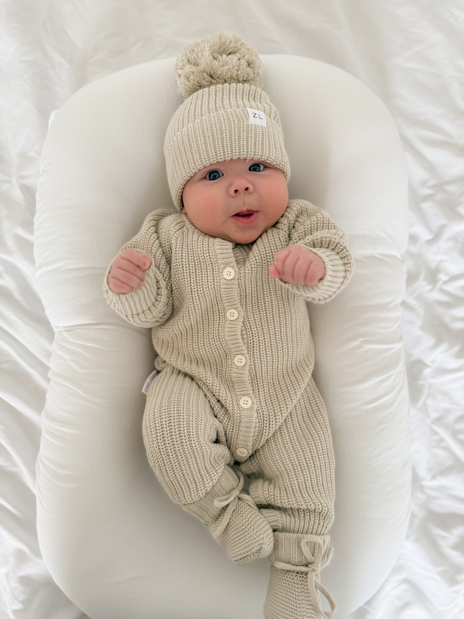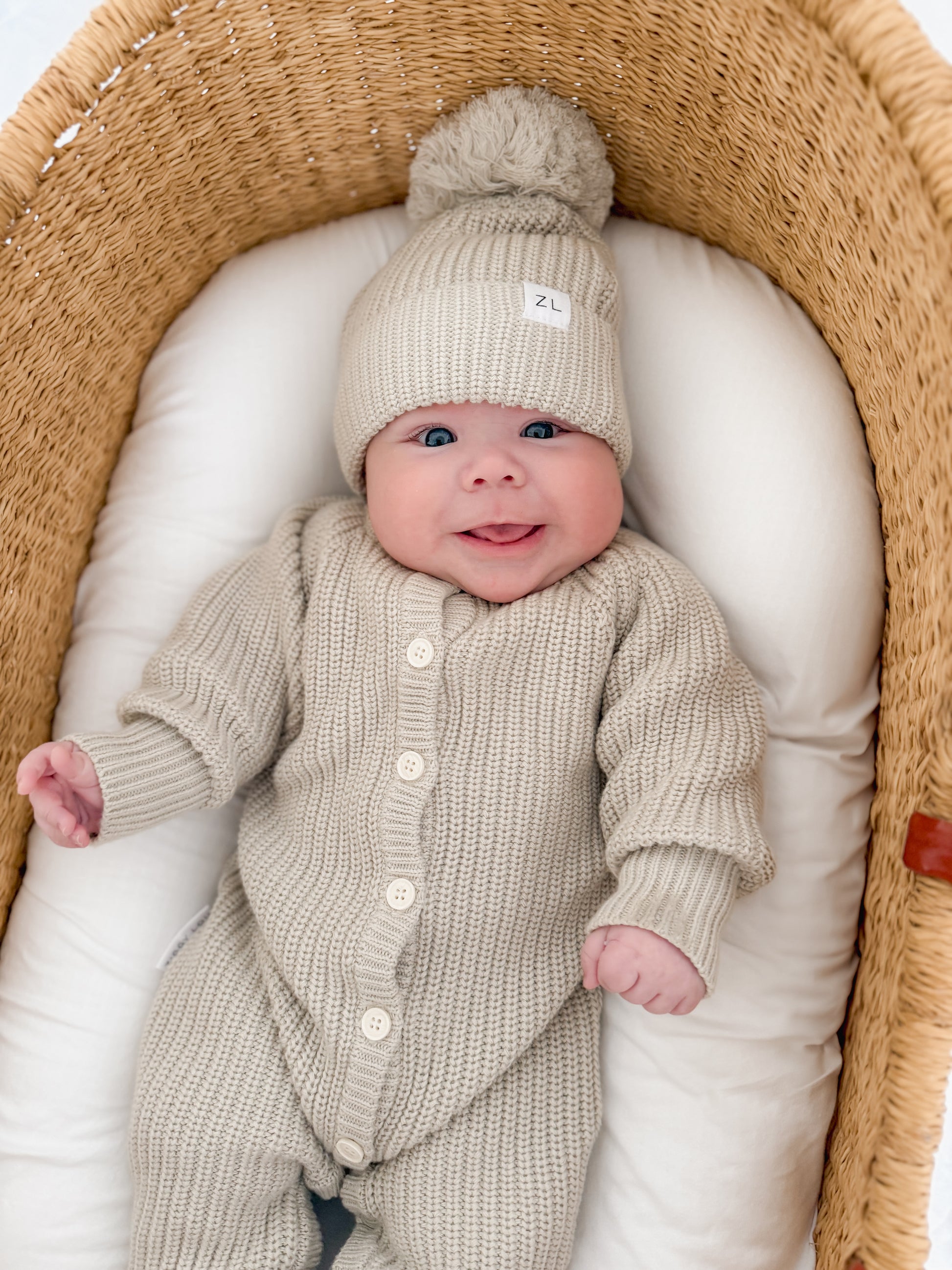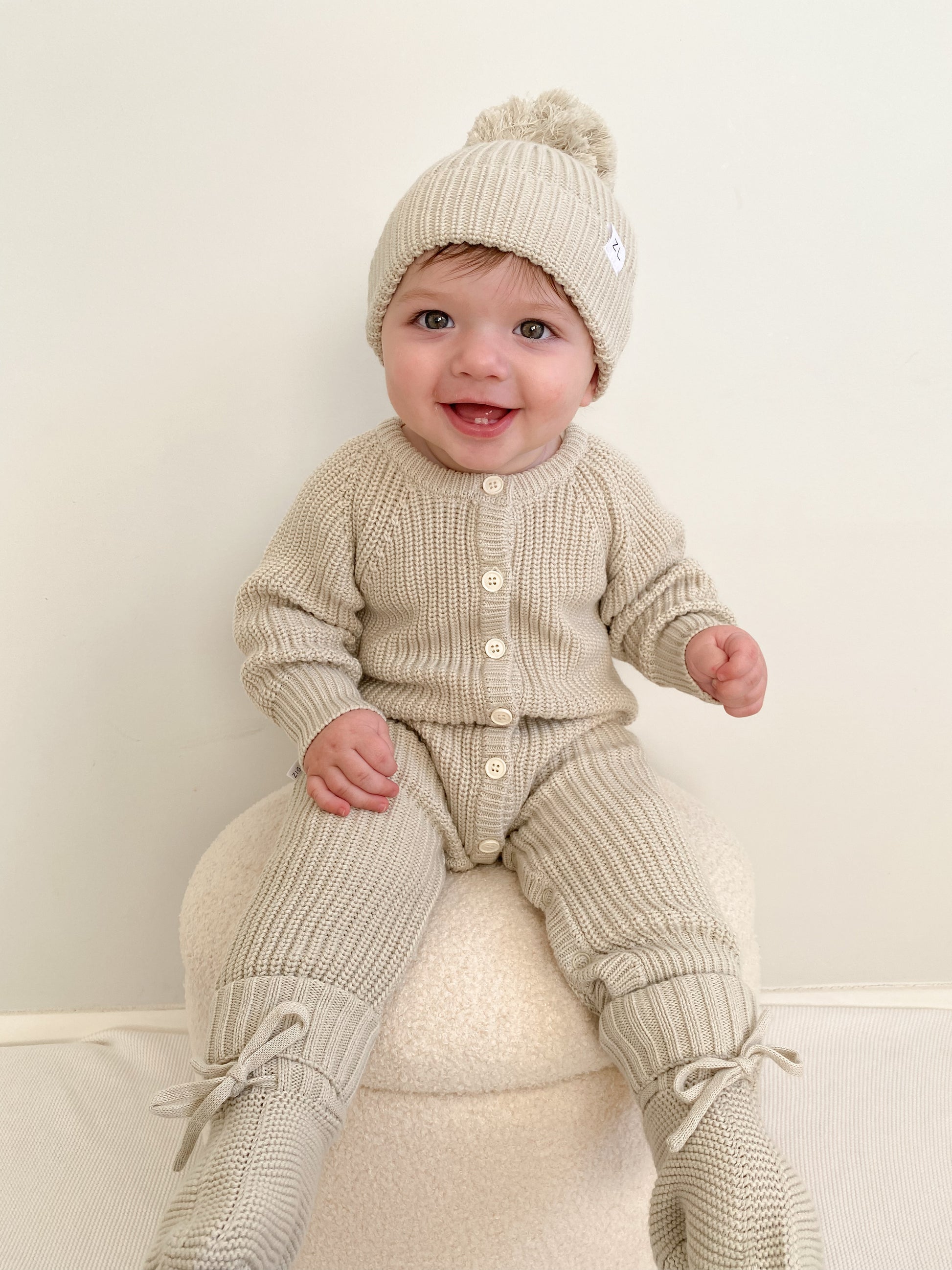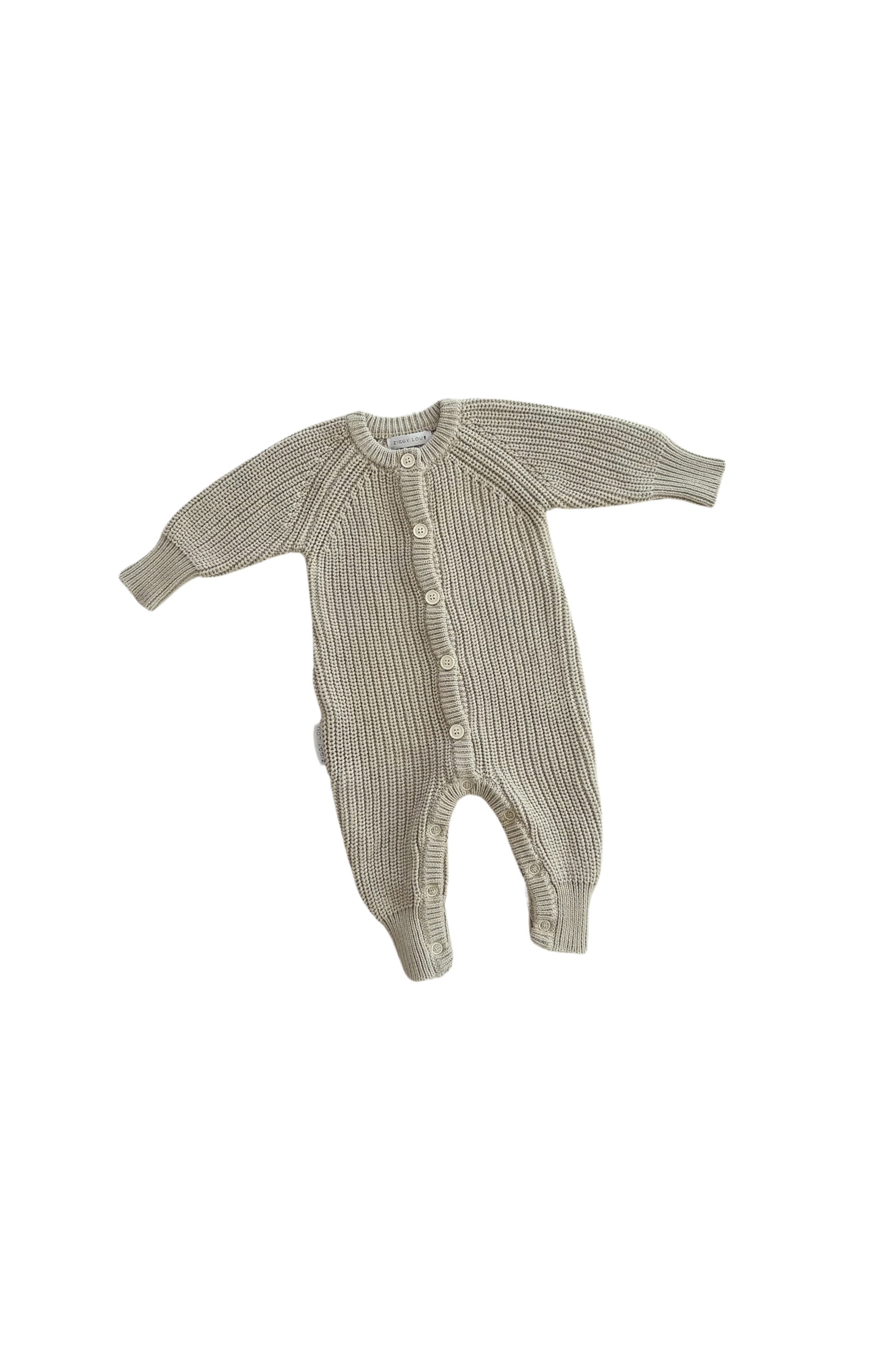 Original chunky knit romper featuring functional buttons down the front and press snaps at crotch and legs for easy nappy change and on/off.