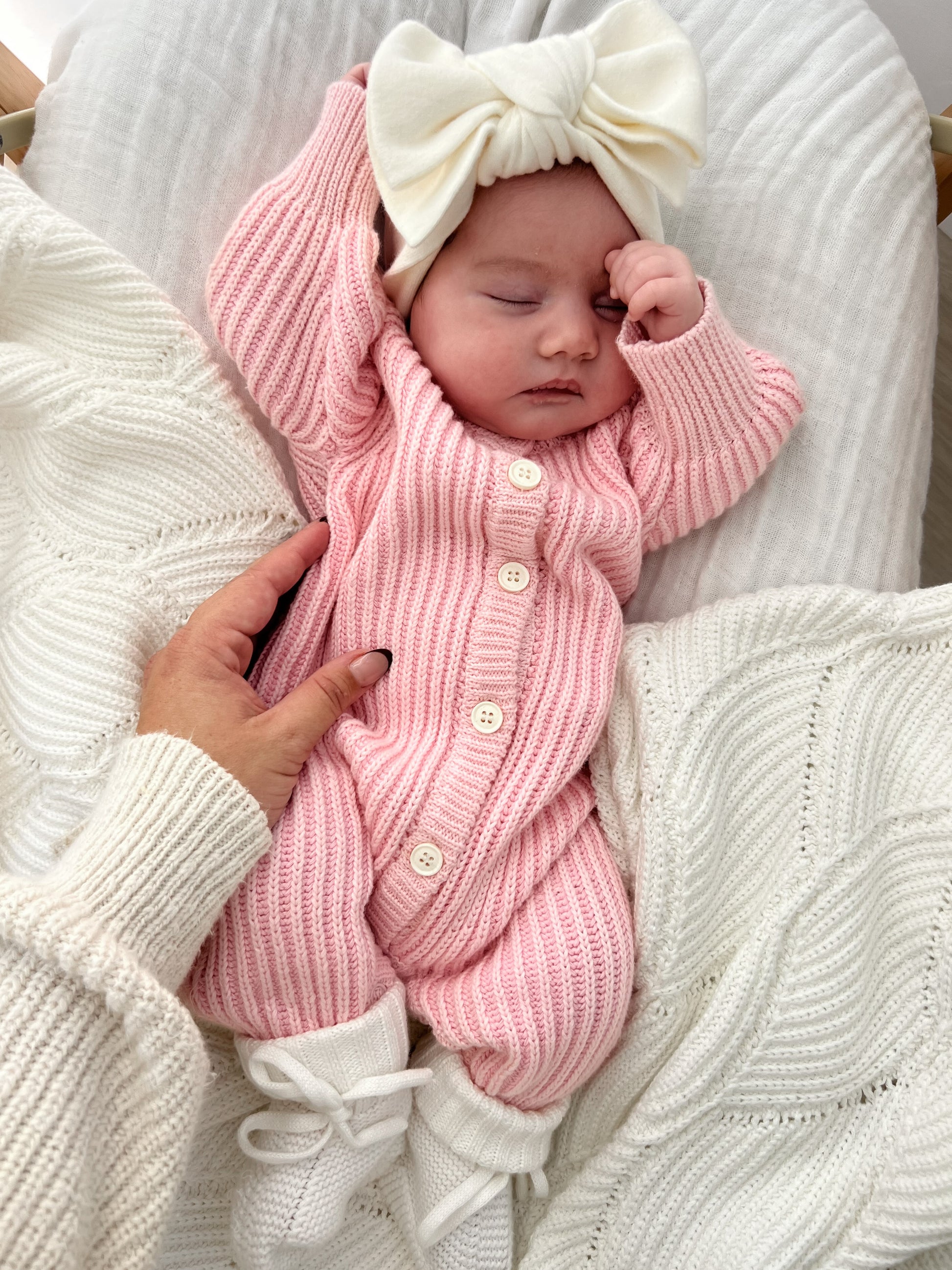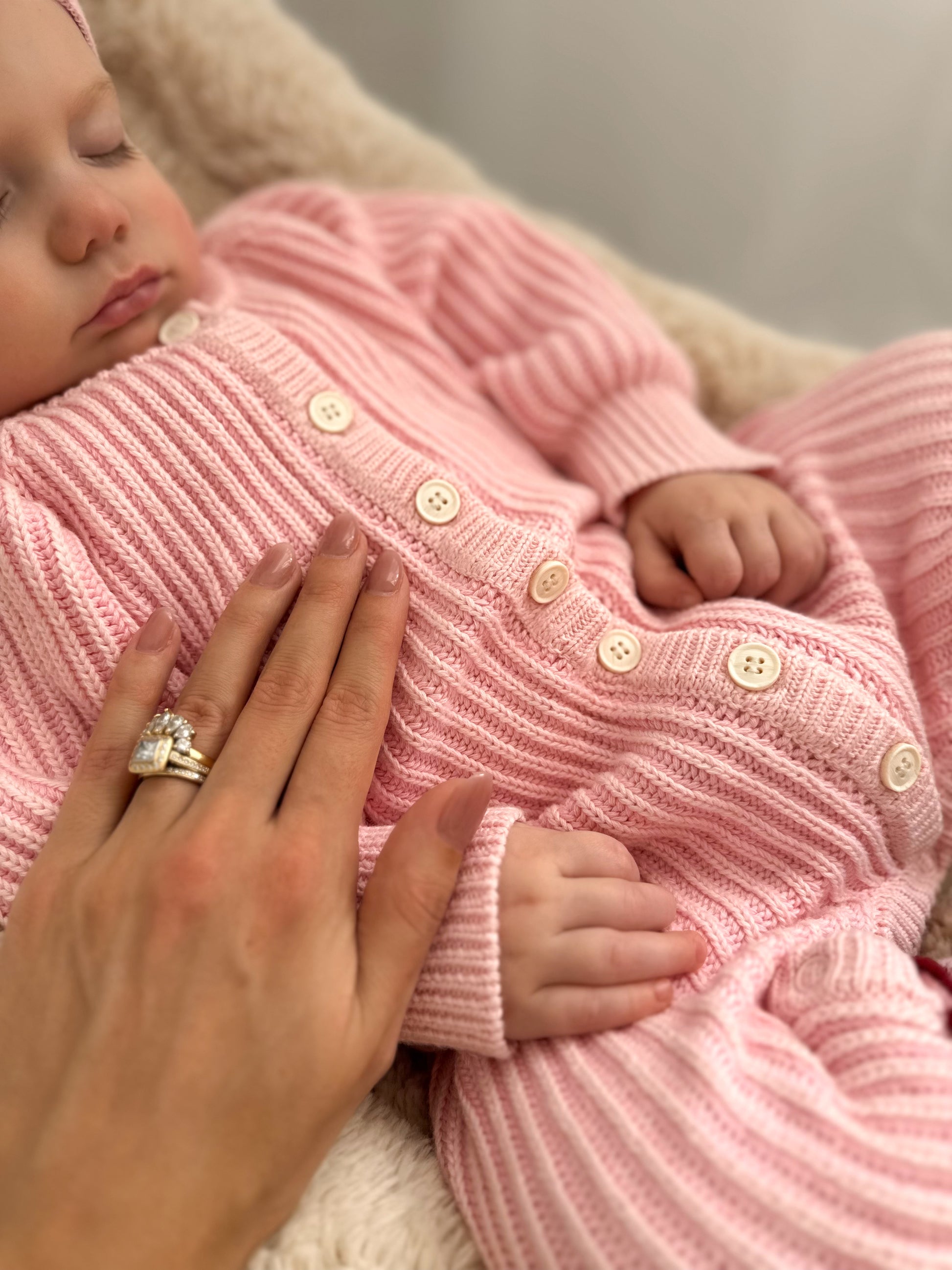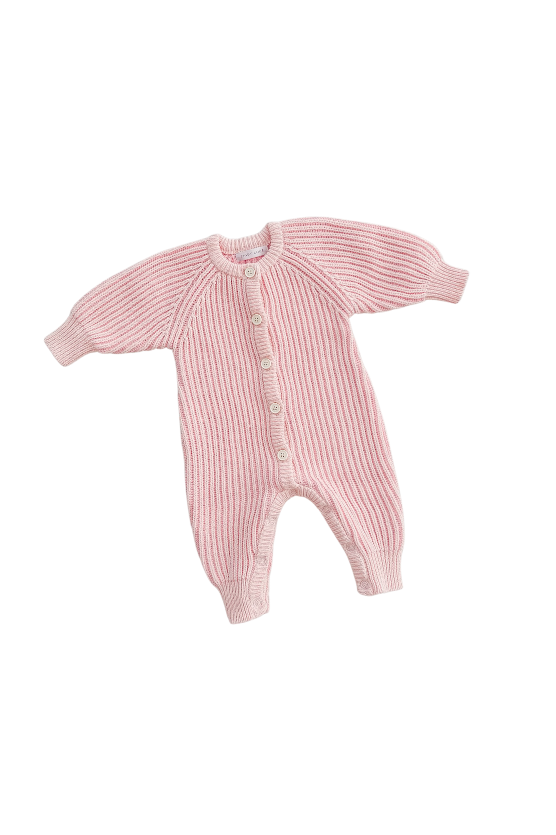 Braided two tone knit Penny romper featuring functional buttons down the front and press snaps at crotch and legs for easy nappy change and on/off.