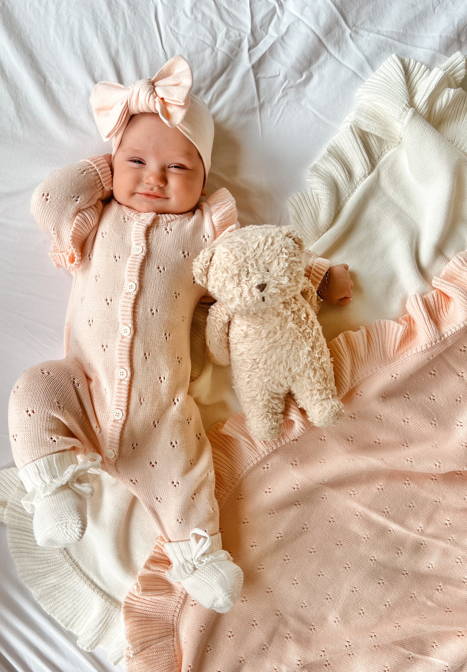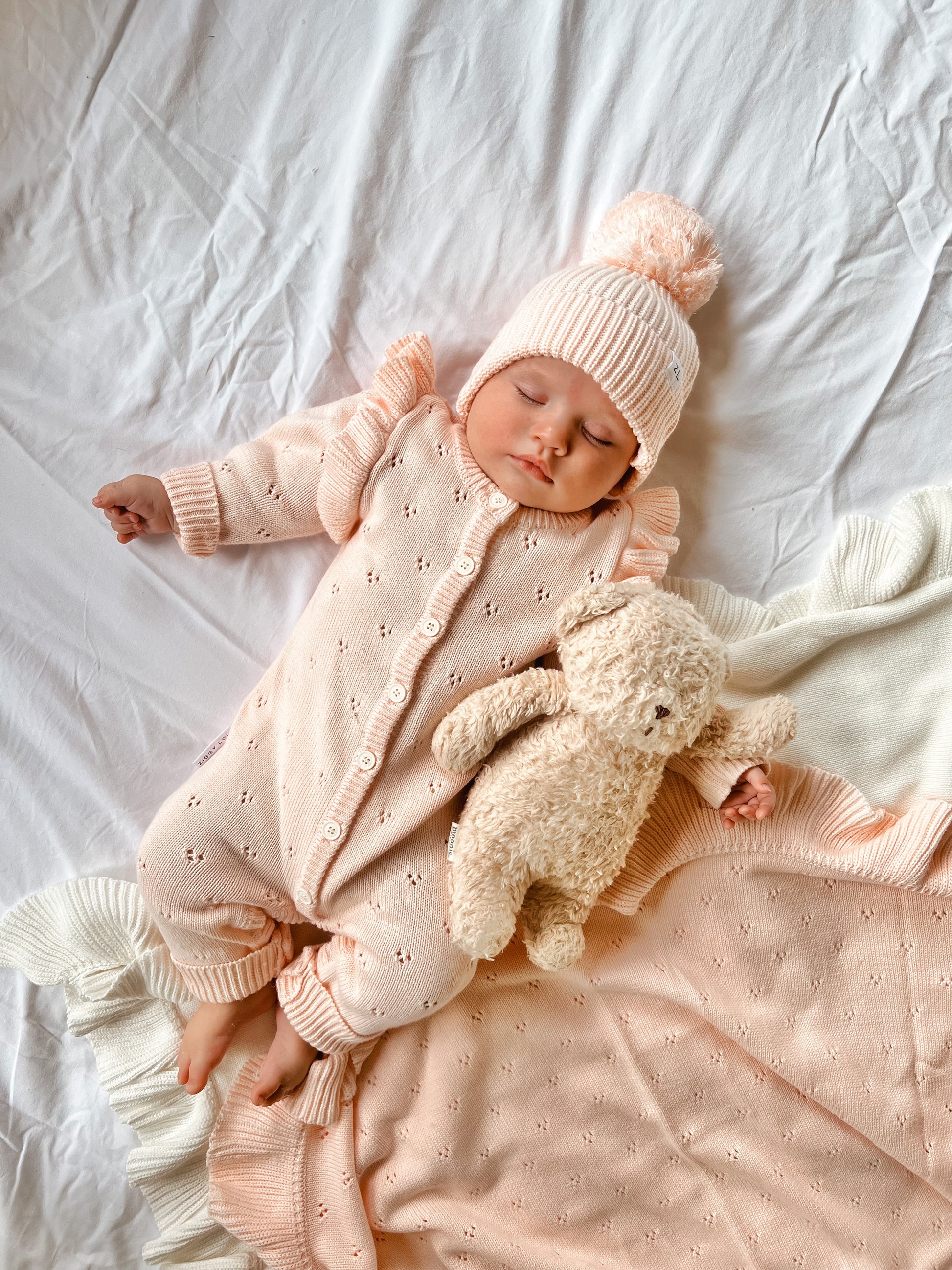 A beautiful knitted romper in our Primrose colour featuring a gorgeous pointelle detail and shoulder frill. Functional snaps at crotch for easy nappy changes. Mix and match with items from our Primrose Signatures Collection for the perfect outfit.