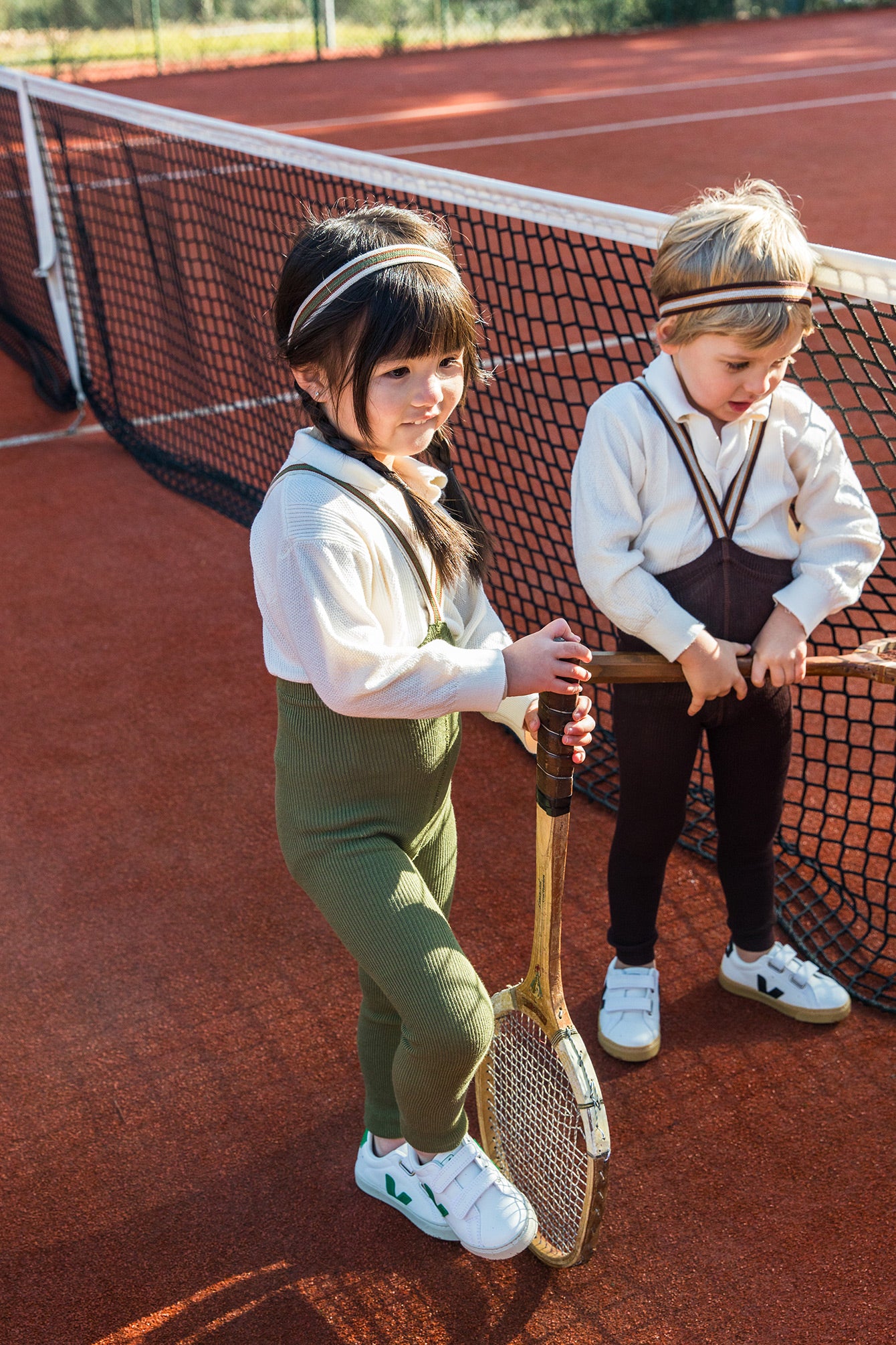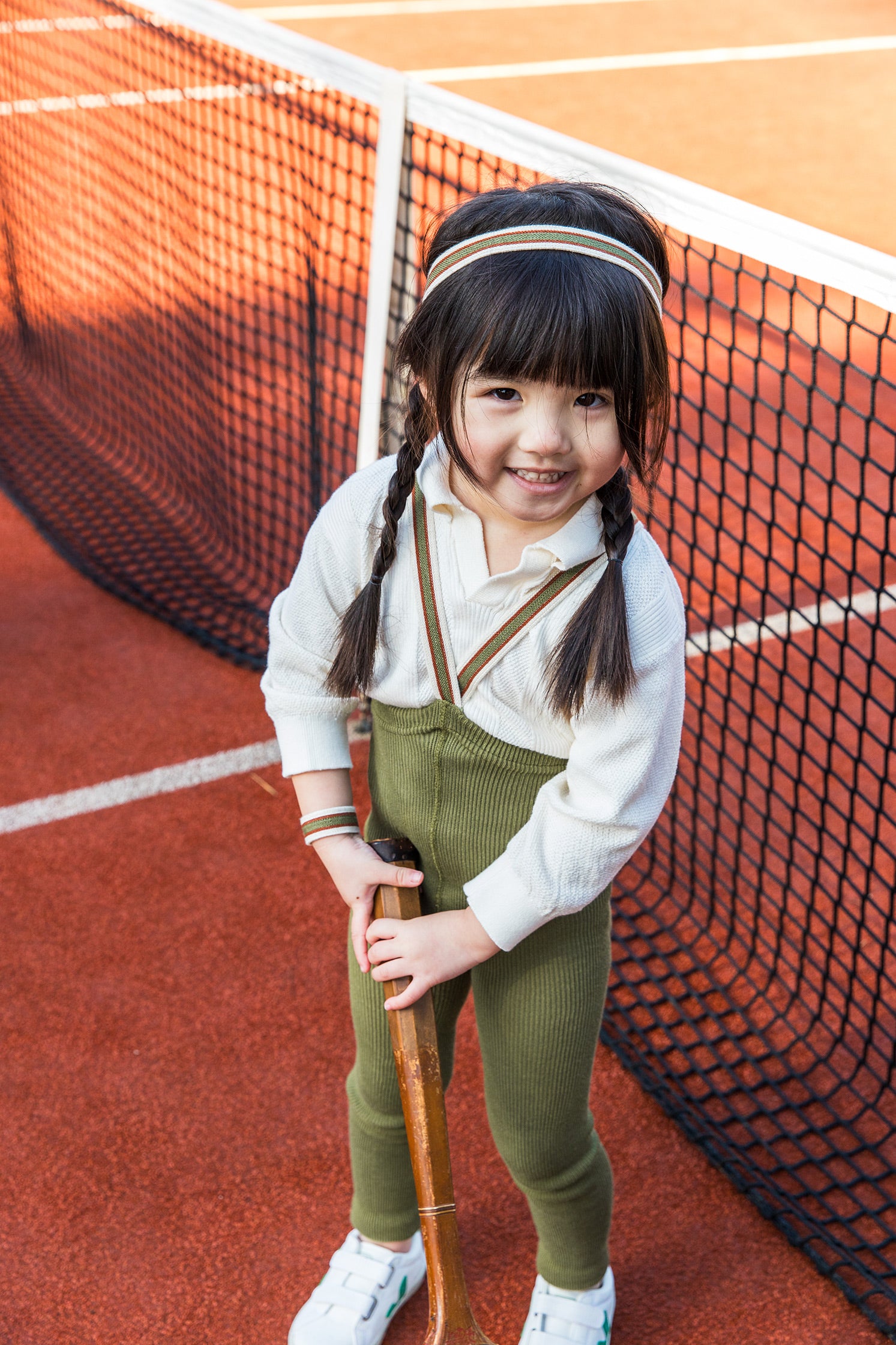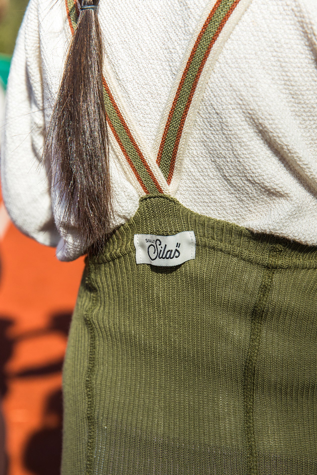 Part of our Retro Champs SS25 Collection, this piece captures the spirit of energy and playfulness with a dash of retro glamour. It features striped braces in tones of olive green, cream, and cinnamon.