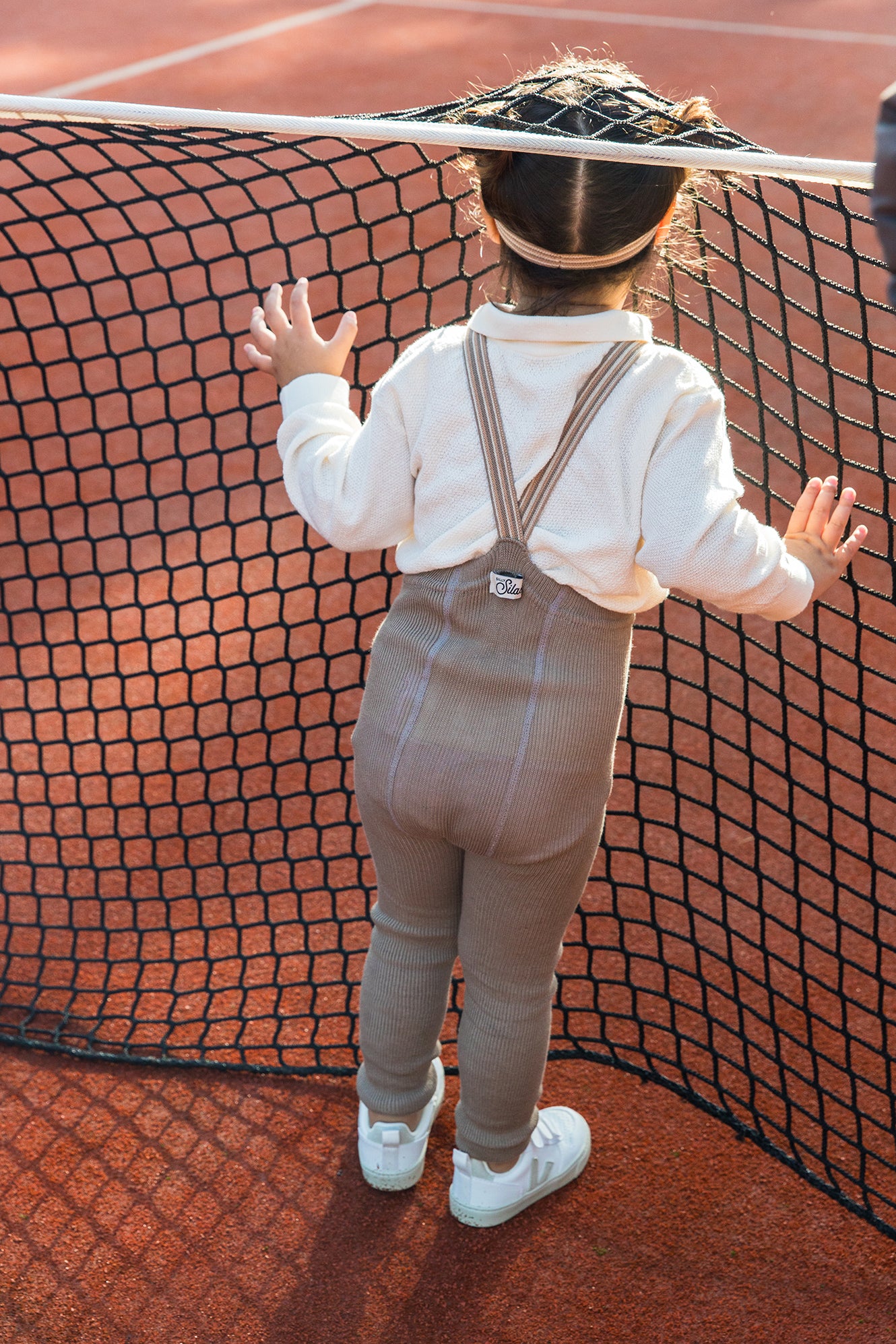 Part of our Retro Champs SS25 Collection, this piece captures the spirit of energy and playfulness with a dash of retro glamour. It features striped braces in tones of oyster grey, cream, and light brown.
