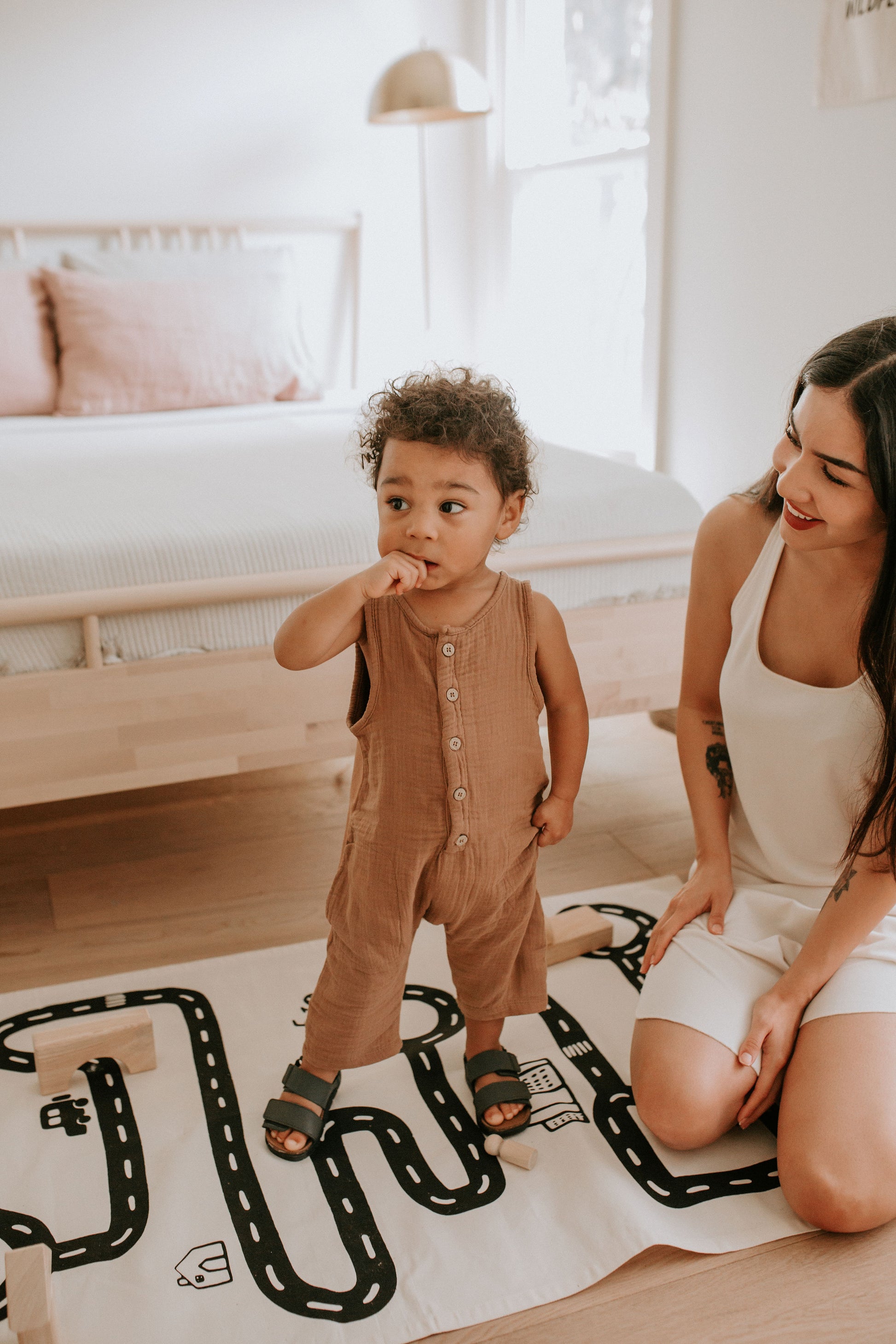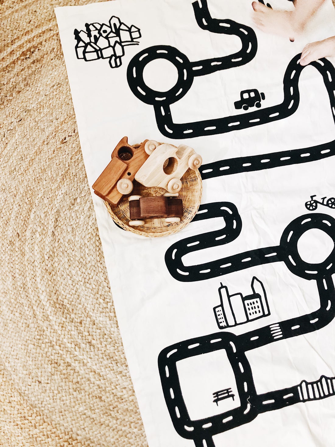 Our floor mat is not only made to go well in any space, but provides a perfect backdrop for hours of open-ended play for your little ones. You can conveniently roll it up and take it with you with sewn in ties.