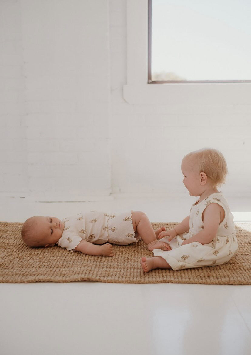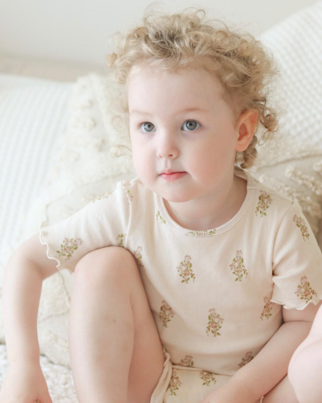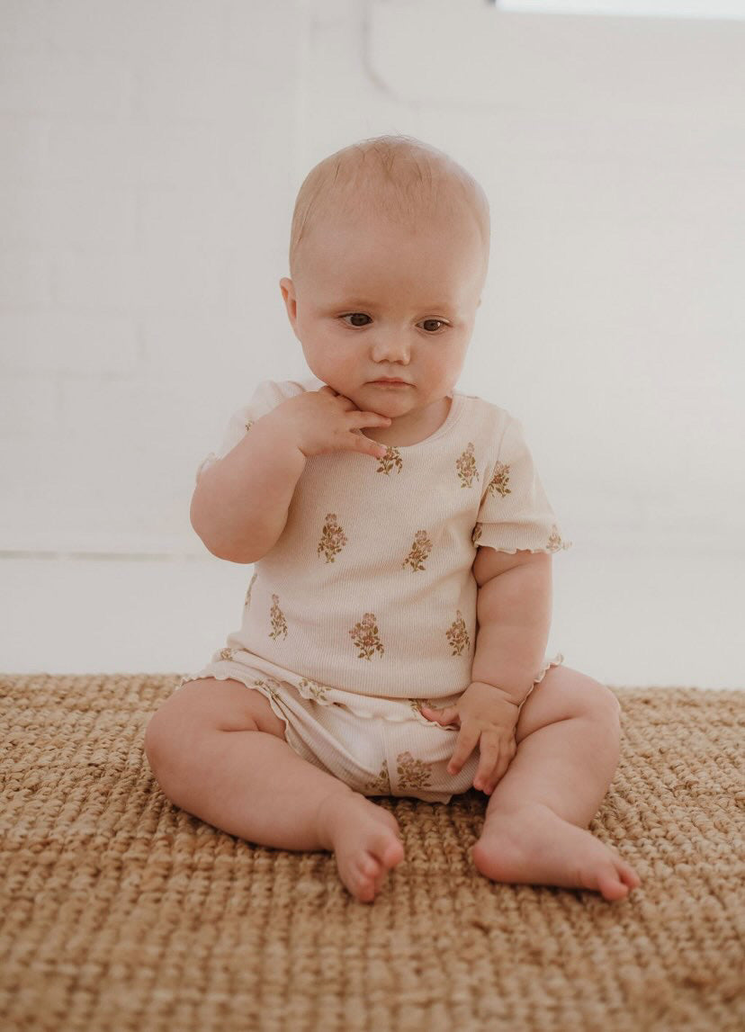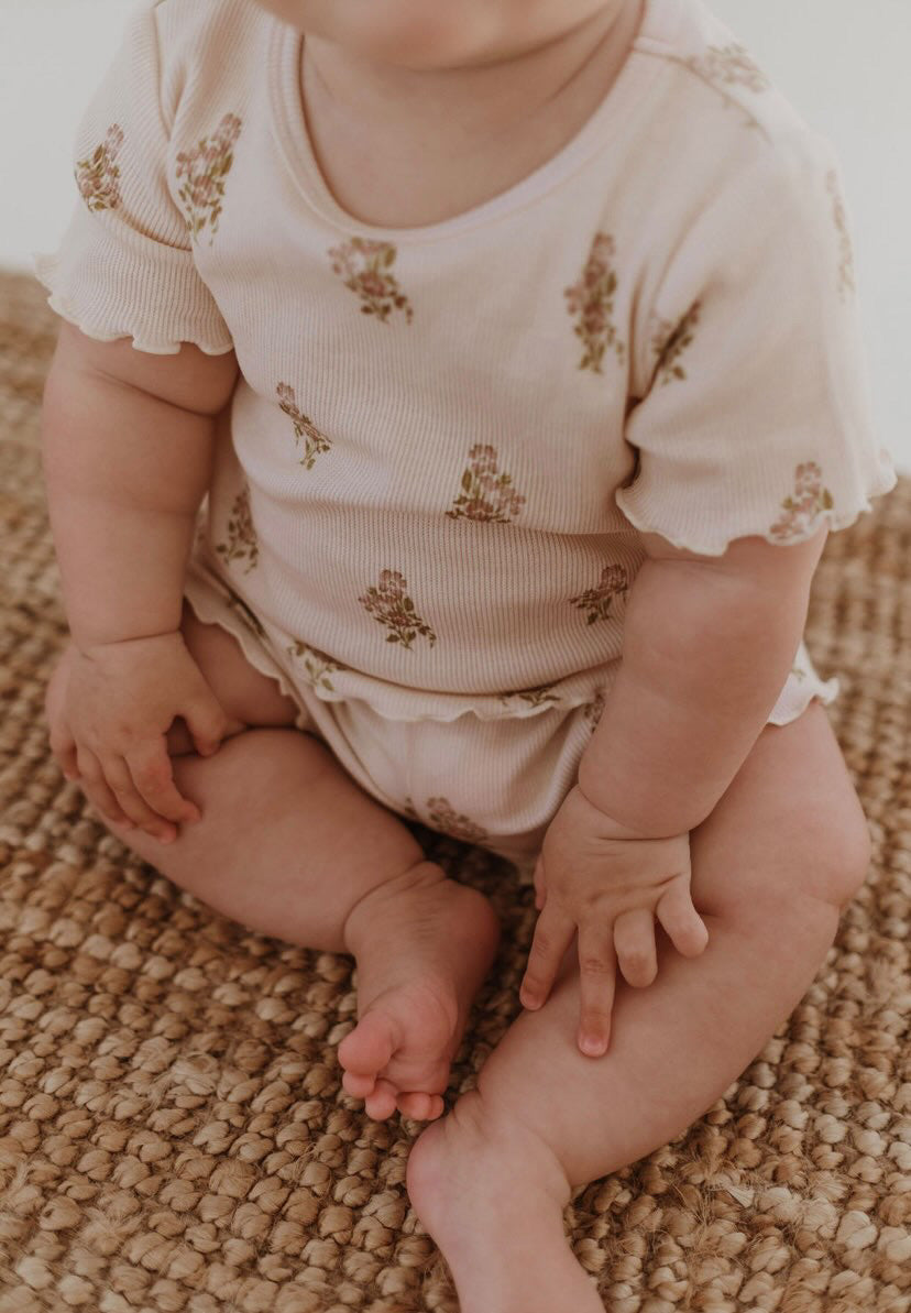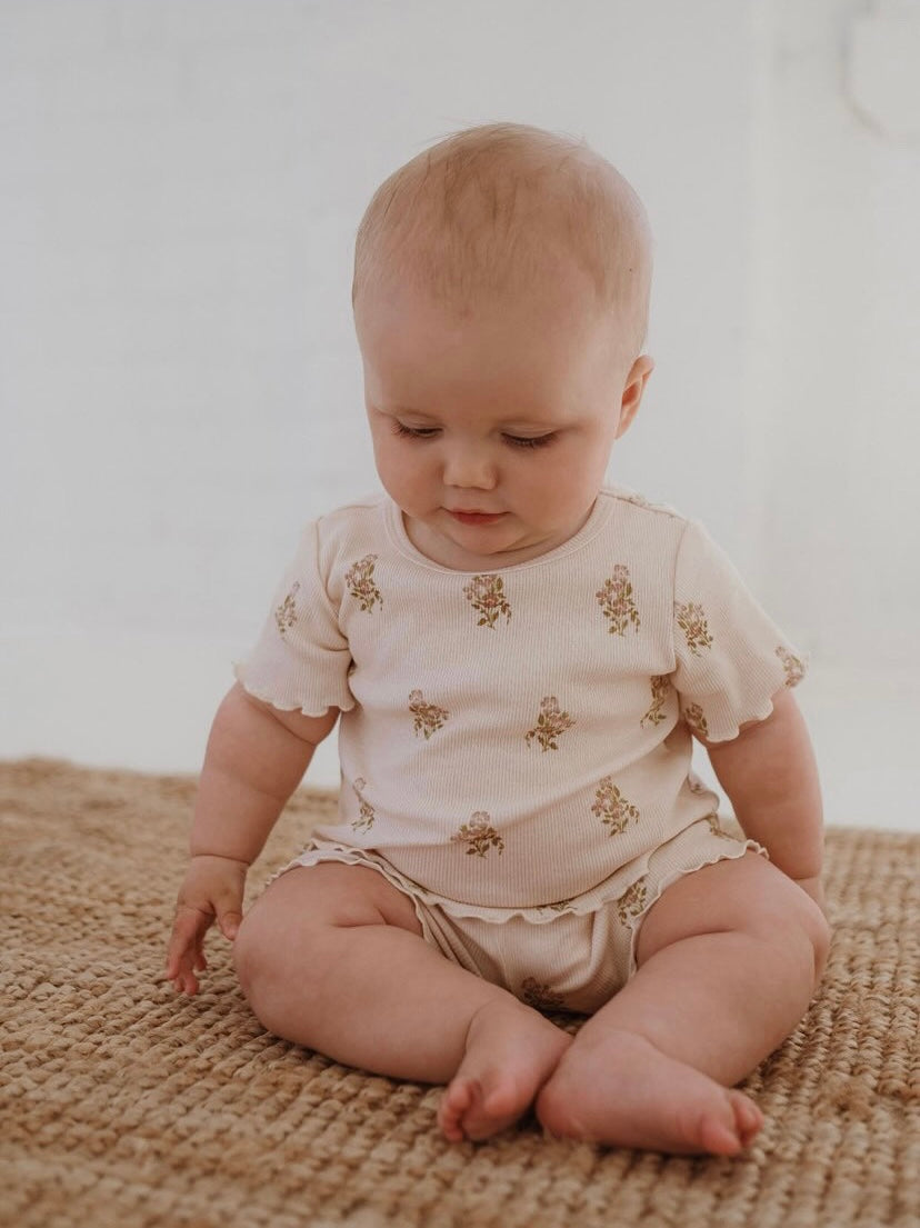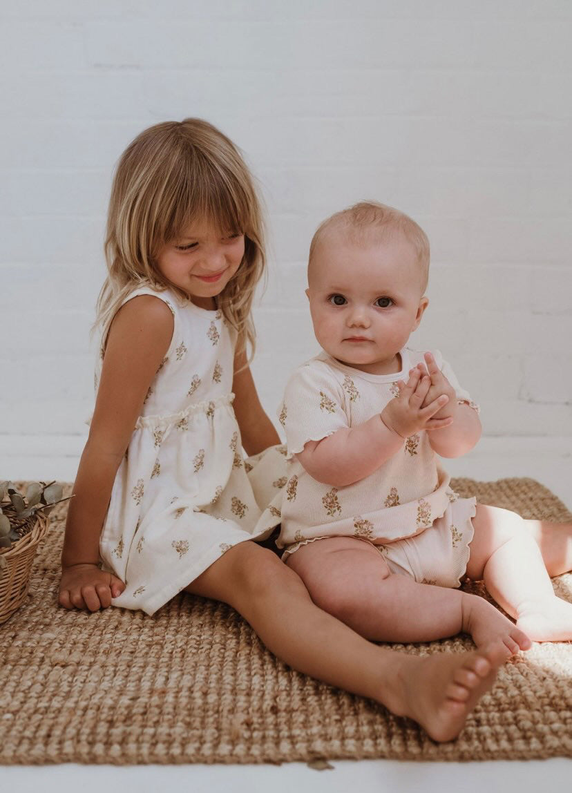 Our most loved set now in the most beautiful cream ribbed floral. The perfect piece for your babes this Summer.