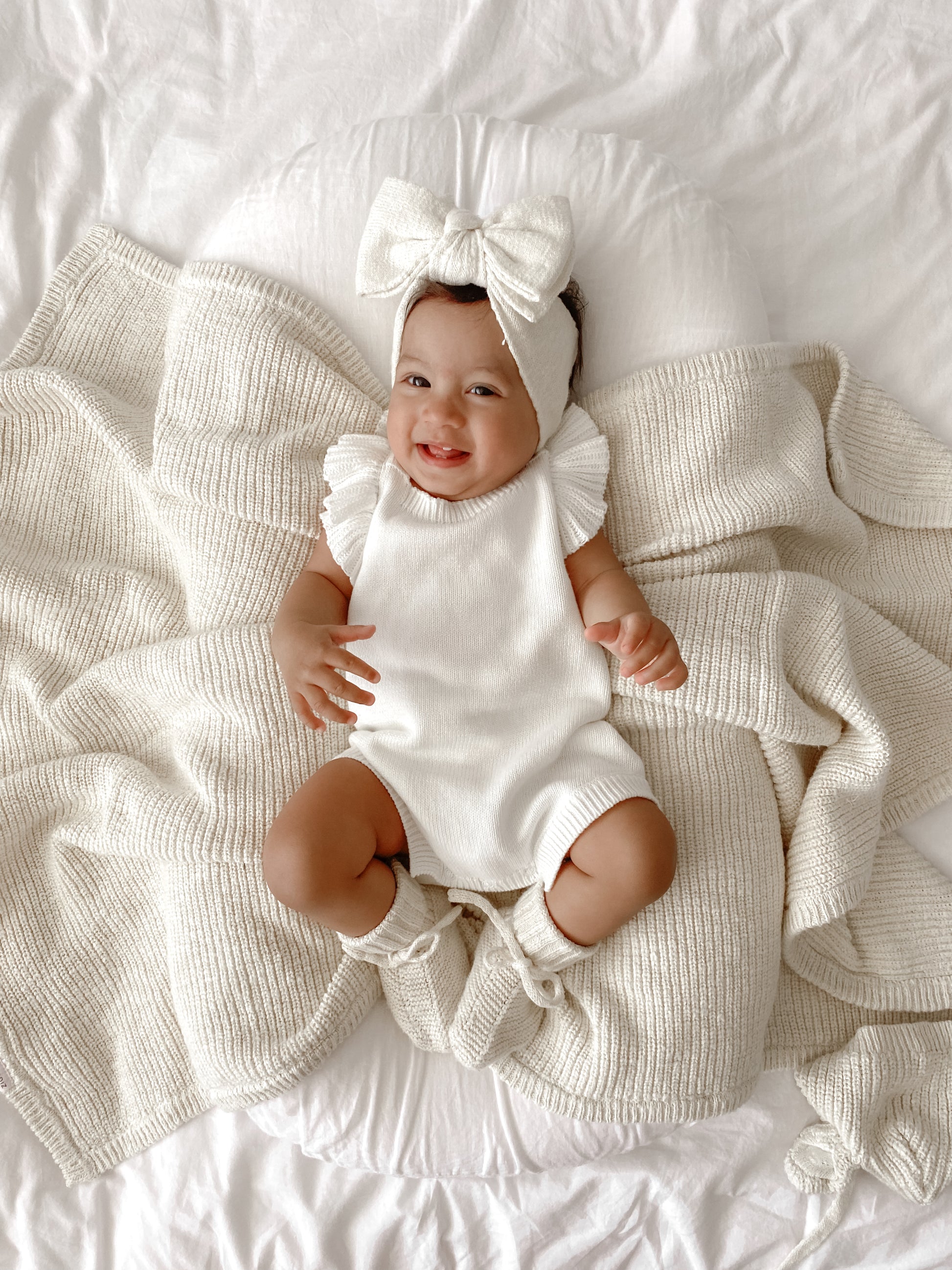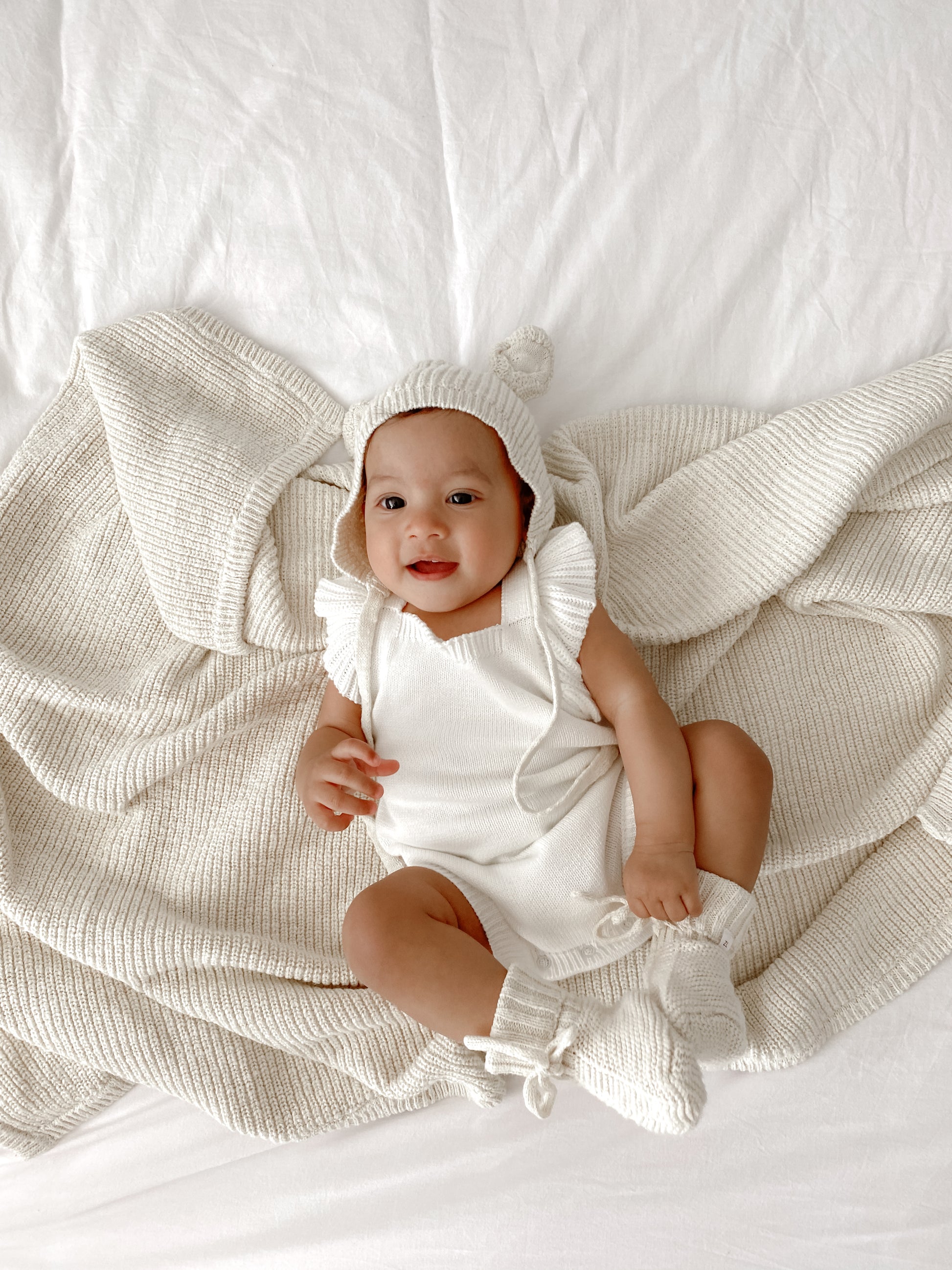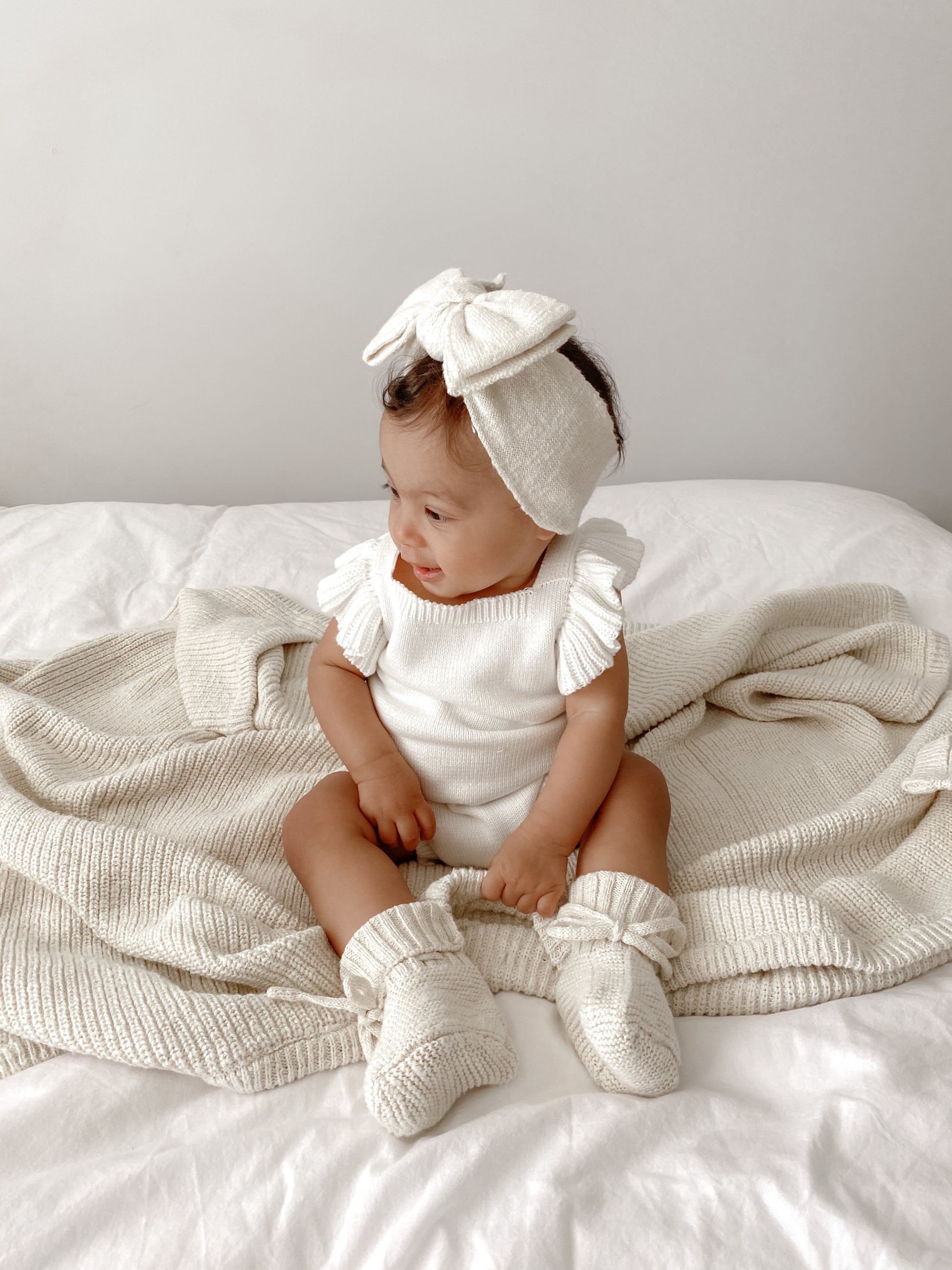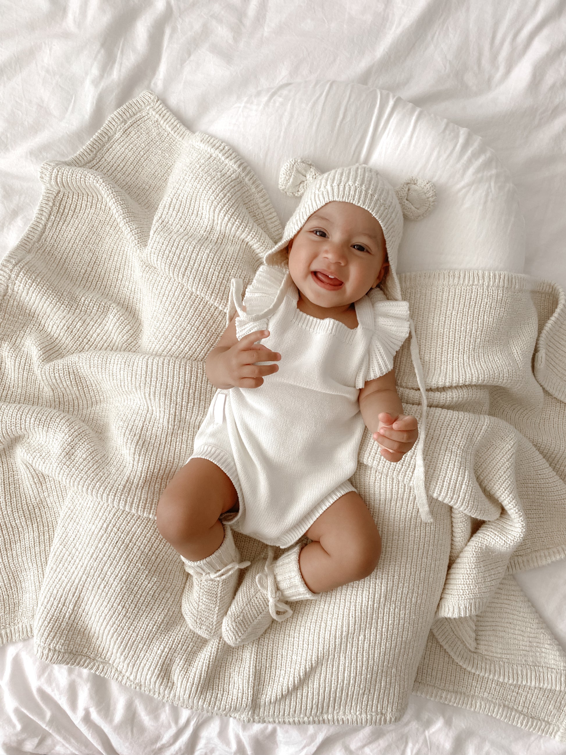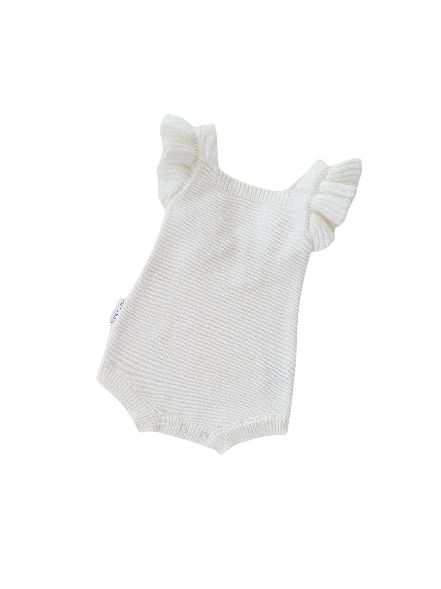 A beautiful knit romper in our Milk colour with gorgeous frill detail on the shoulders. Functional snaps at crotch for easy nappy changes and adjustable buttons on shoulder straps for easy on/off. Matching Bonnet, Blanket and Booties in Milk also available or match with any items from our Milk Signatures Collection.