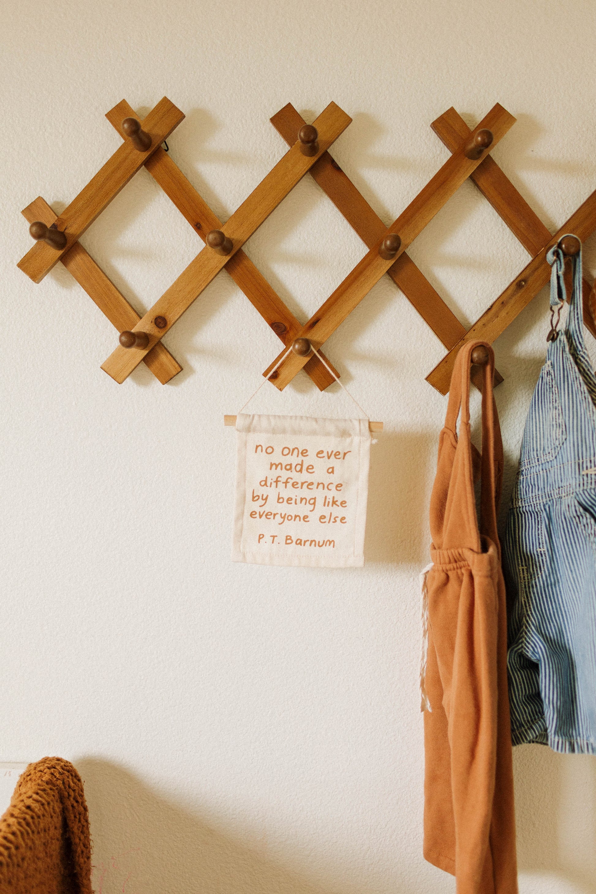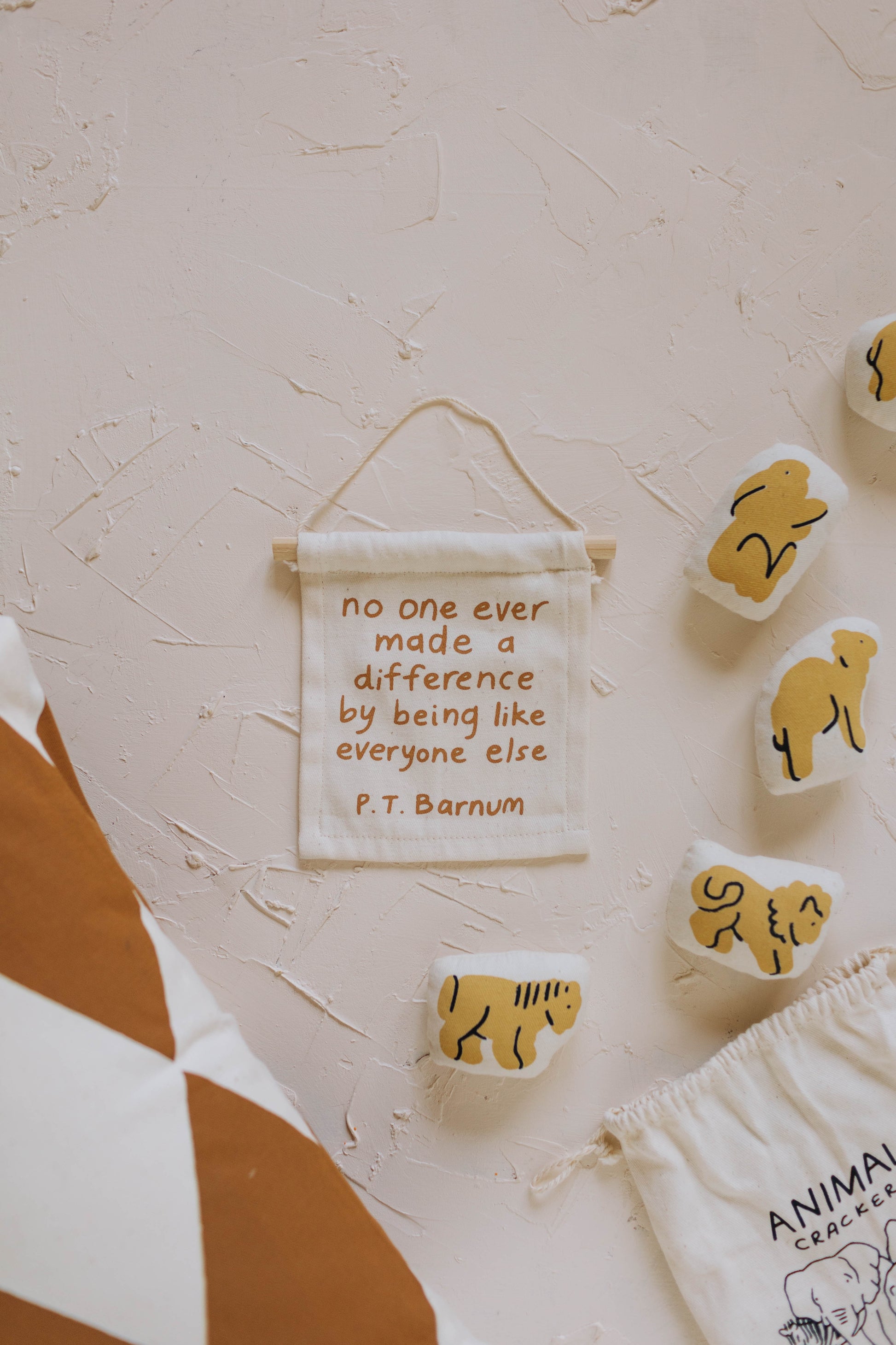 P.T Barnum on natural canvas hang sign with a wooden dowel. Sewn and screen printed by hand on natural canvas by Kenyan artisans.