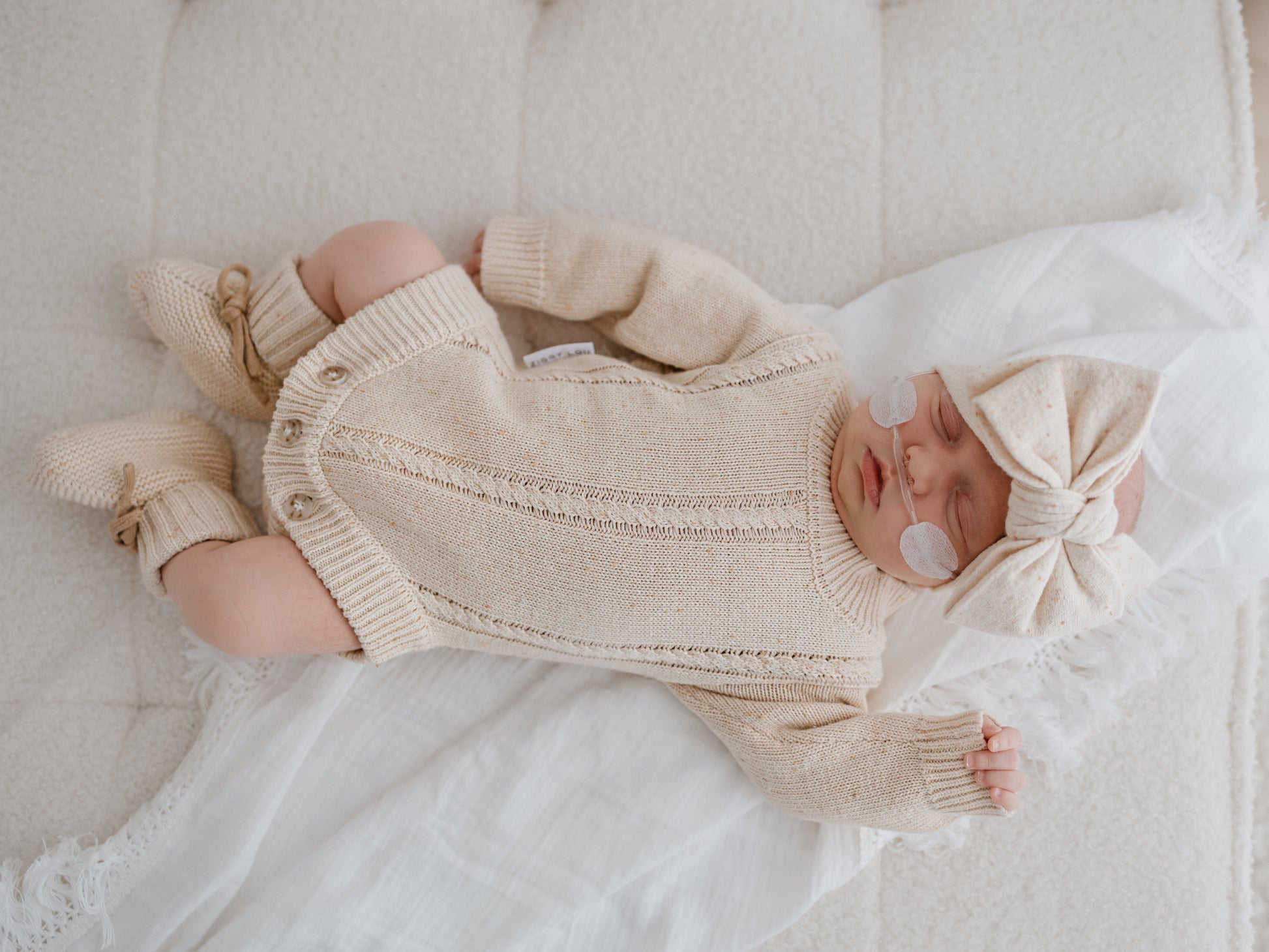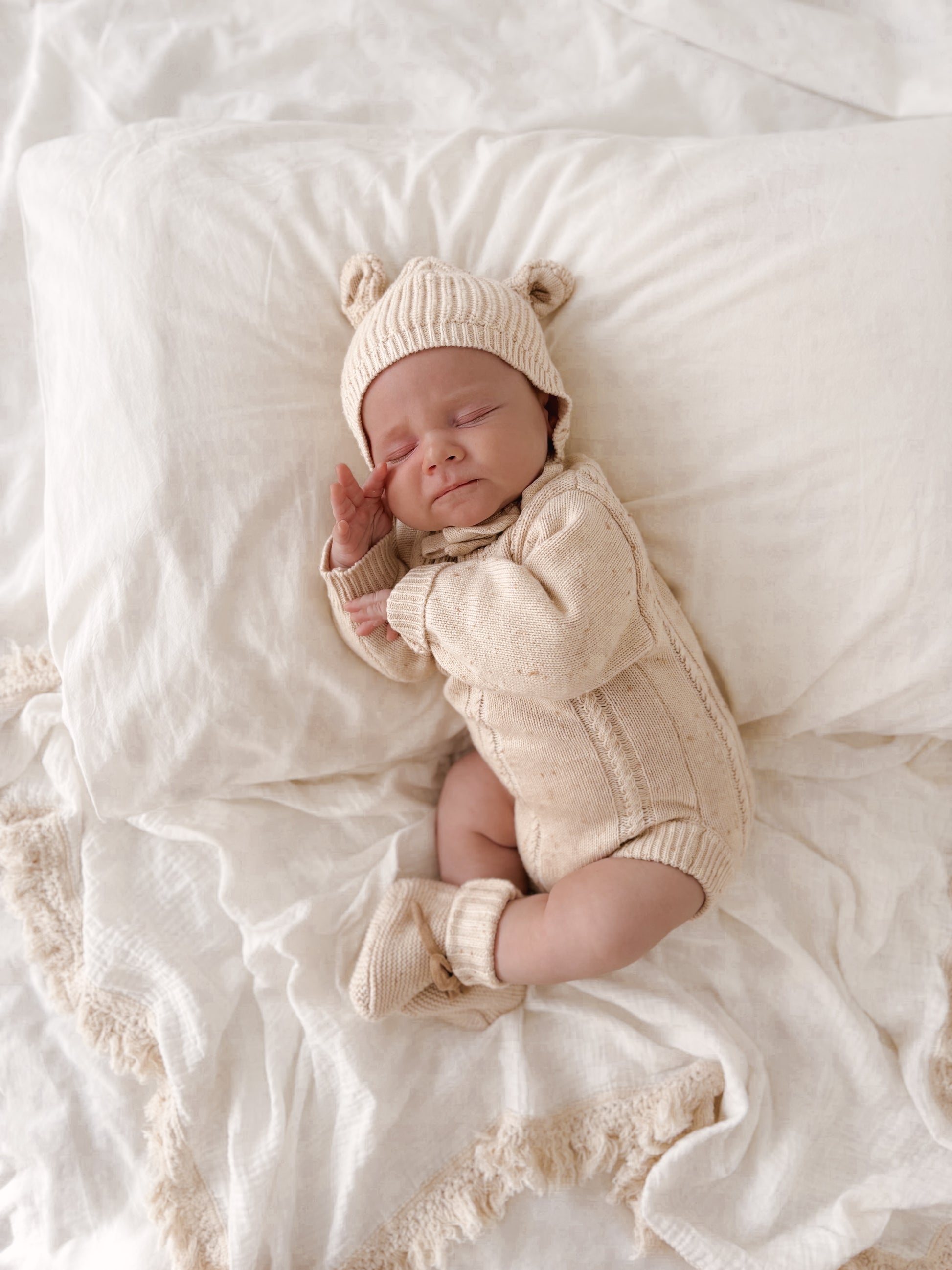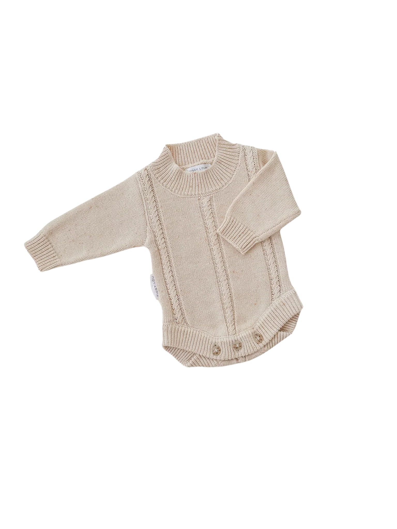 A beautiful Biscotti Fleck knitted romper, with gorgeous braid detail, thick cuffs and a relaxed fit around the bodice. Matching bonnet, booties + beanie available in our Biscotti Fleck Signatures Collection.