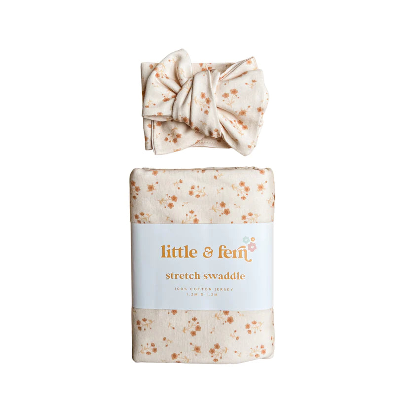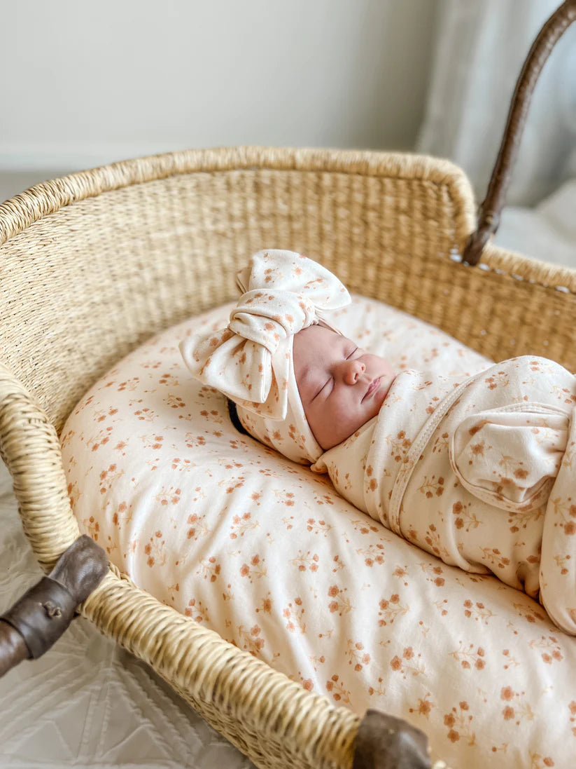 Our Paisley jersey swaddle boasts the most delicate muted rust and cream floral design, this set makes the most precious baby shower gift, perfect set for an announcement photo, or just a wonderful addition to any little babe's wardrobe.