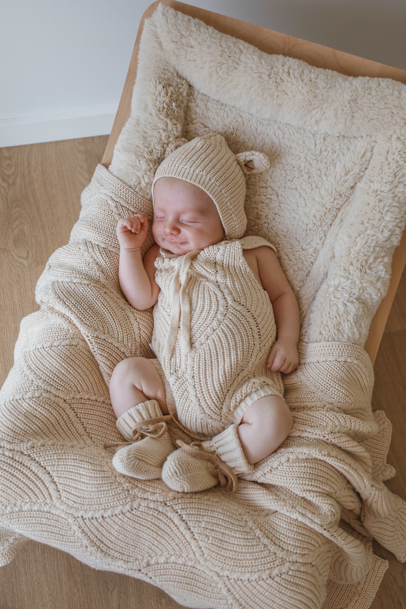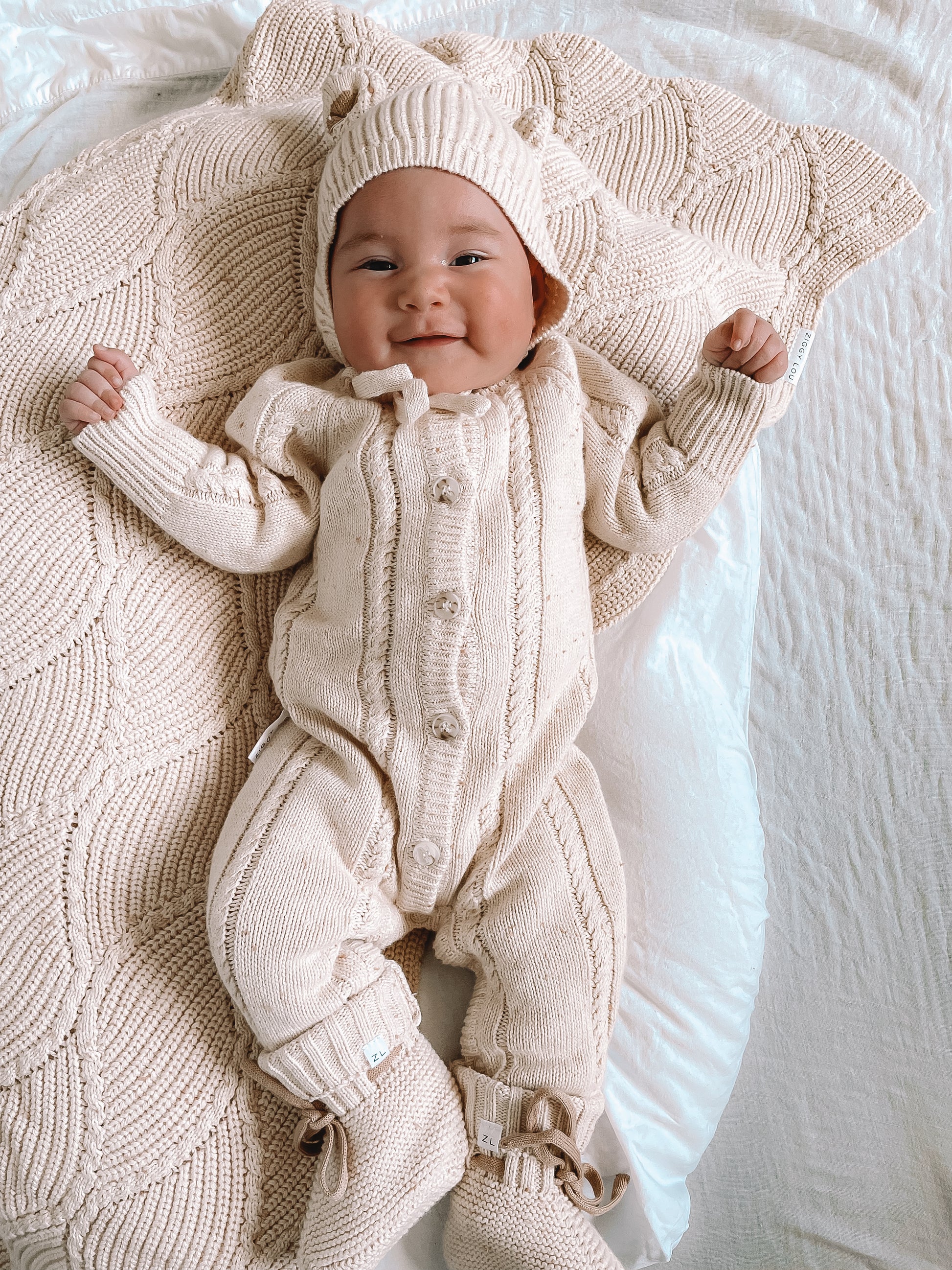 Beautiful knitted blanket with diamond wave knit detail. Perfect staple blanket for your little one. Mix and match with items from our Biscotti Fleck Signatures Range.