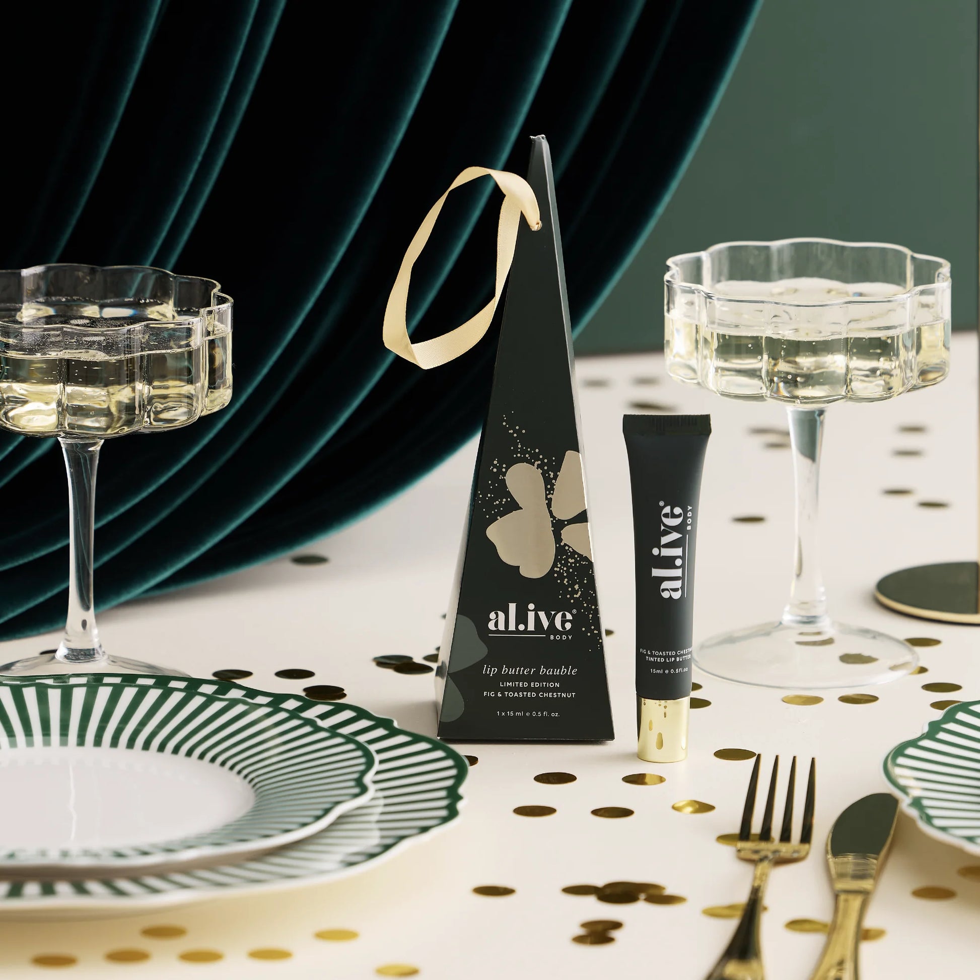 Add a touch of festive charm to your tree and your lips with our limited edition Champagne Shimmer Lip Butter Bauble. This nourishing, tinted lip butter moisturises your lips while imparting a beautifully wearable nude shimmer—perfect for the holiday season.