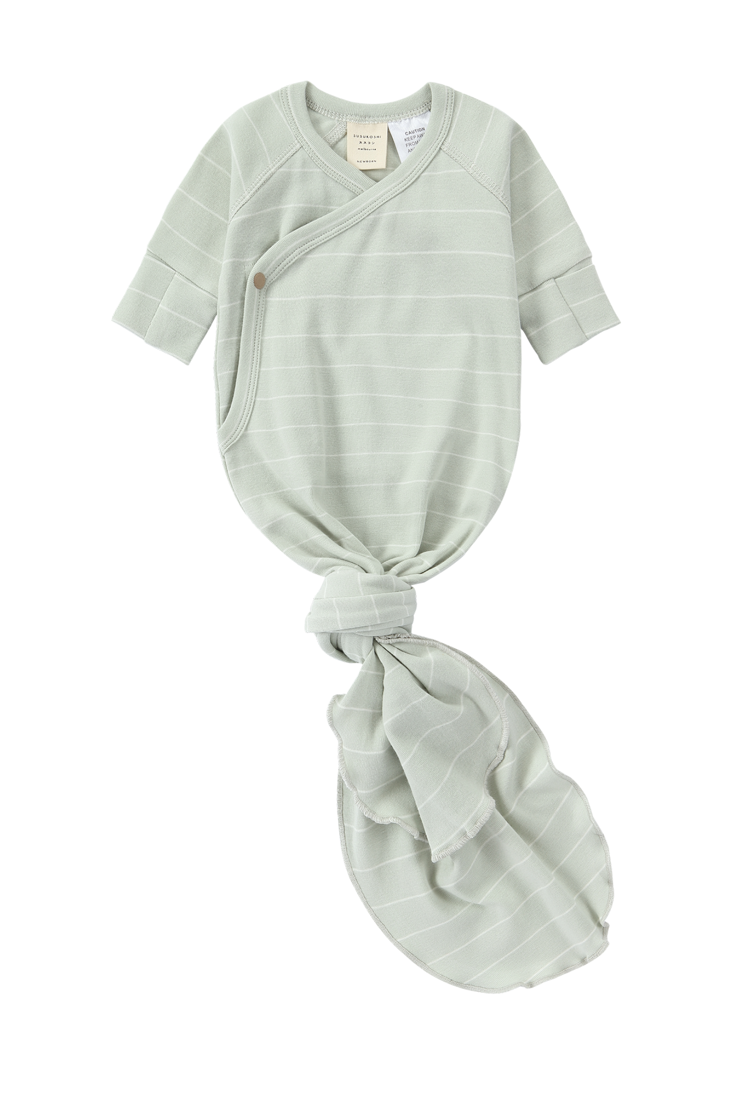 Designed especially for the love of newborns. Features a top snap button kimono top and a long gown bottom that can be knotted into a swaddle and undone for easy changing access. It also features folded mitten hands, perfect for cooler days or nights.