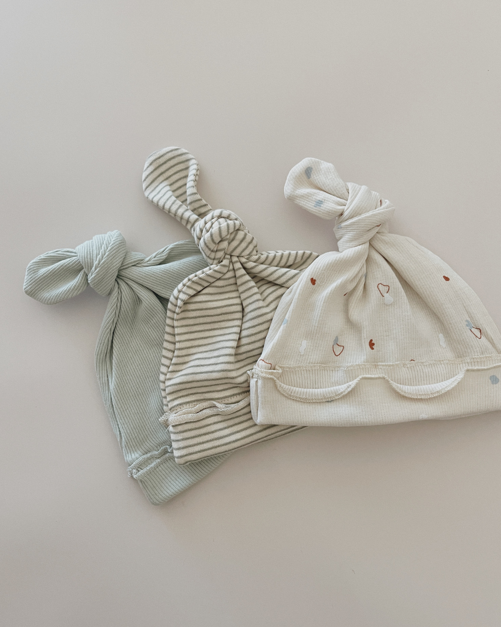 Made from a beautiful soft organic cotton elastane, suitable for baby's delicate skin. Our knotted beanie is one of the most essential items for new bubs.