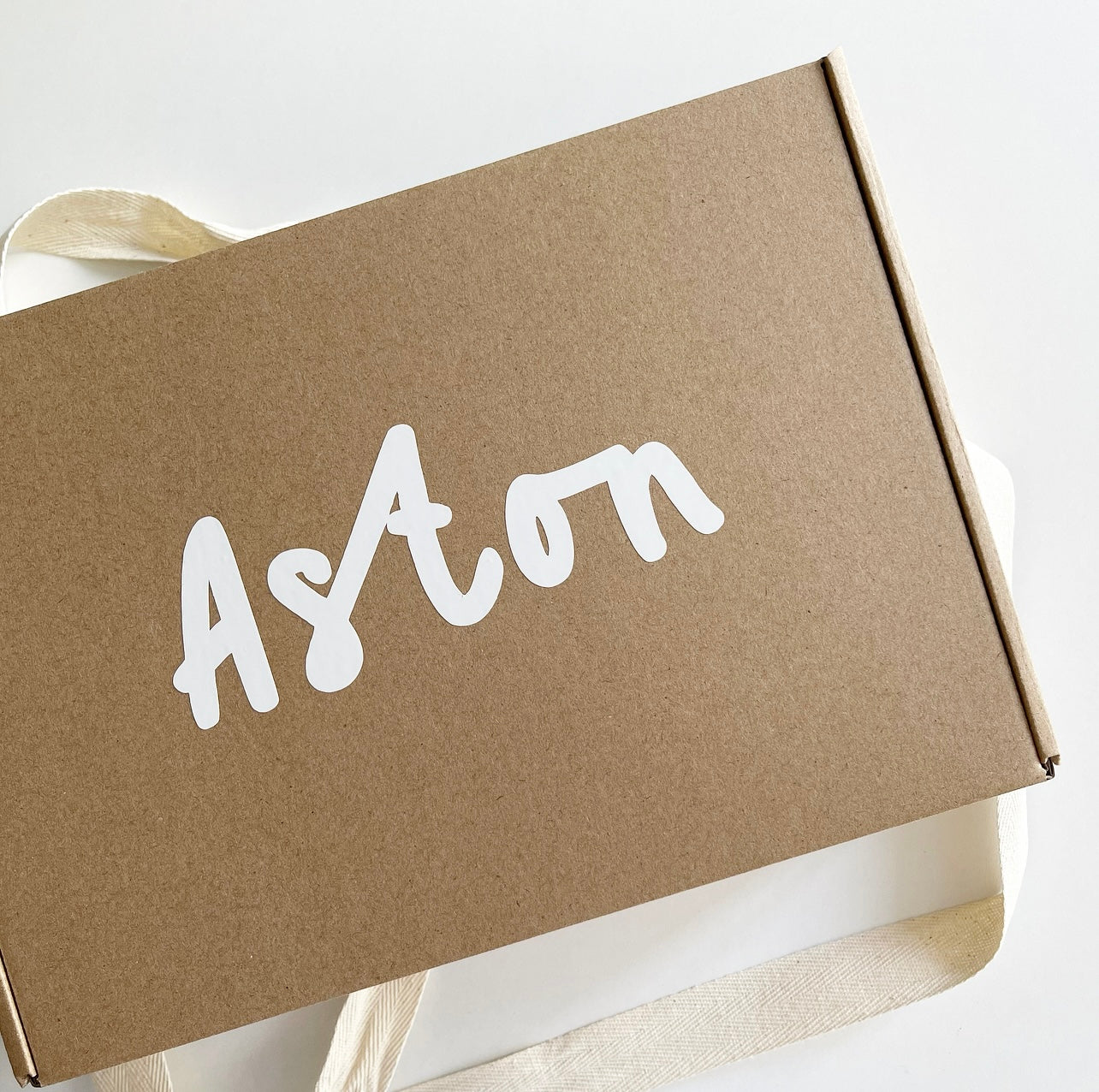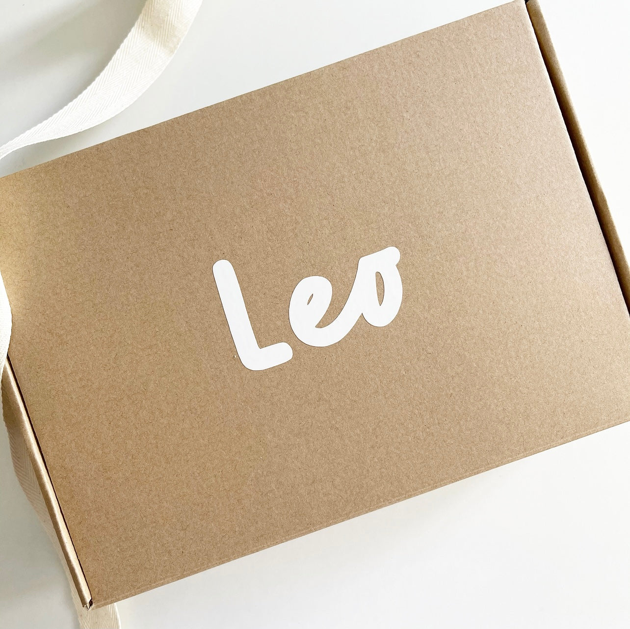 Details | Includes Box and Personalisation. Beautifully wrapped in cotton herringbone ribbon. First name written in Leo + Zo signature font, White Vinyl Decal, placed in the middle centre of the box (kraft colour).