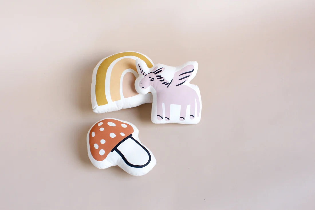 Mushroom pillow sewn and screen printed by hand on natural canvas by local artisans.