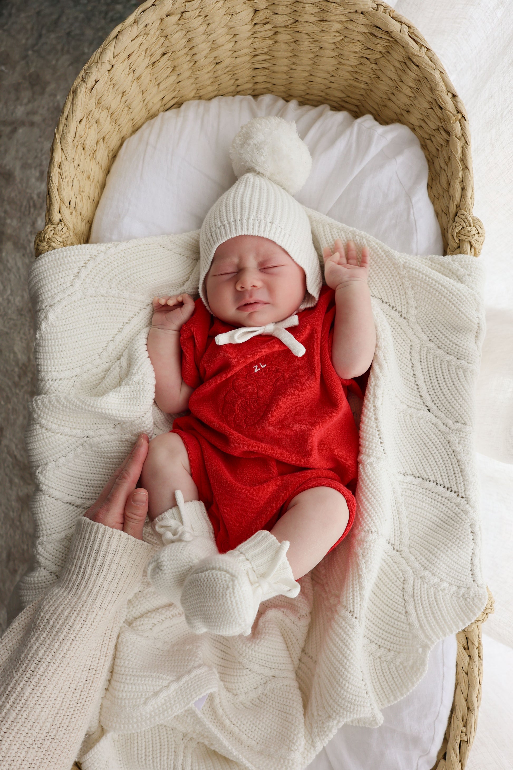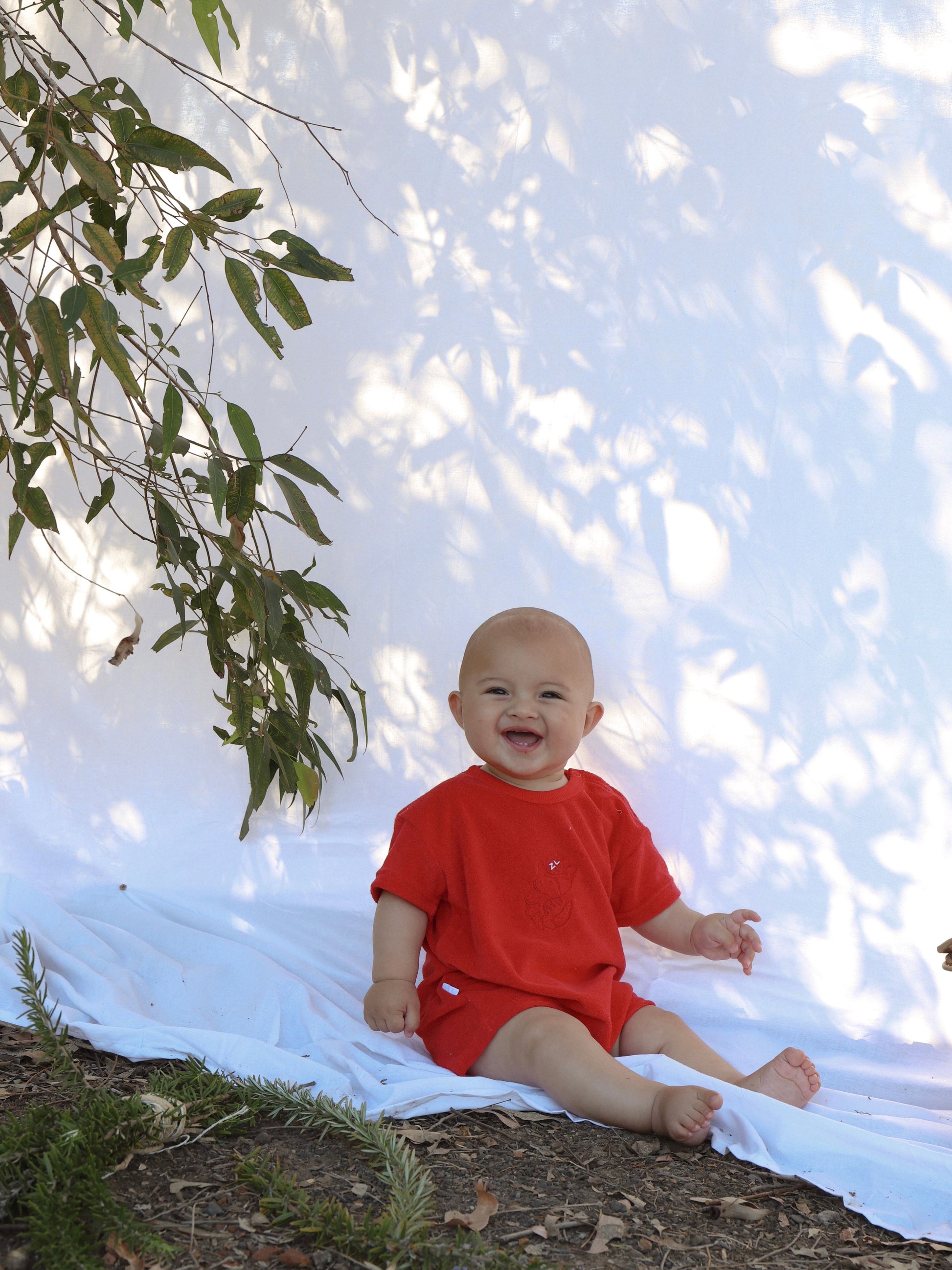 Terry towelling playsuit featuring our Shawn the Prawn design on the front. Functional press snaps at crotch for easy nappy changes and press snaps at shoulders for easy on/off.