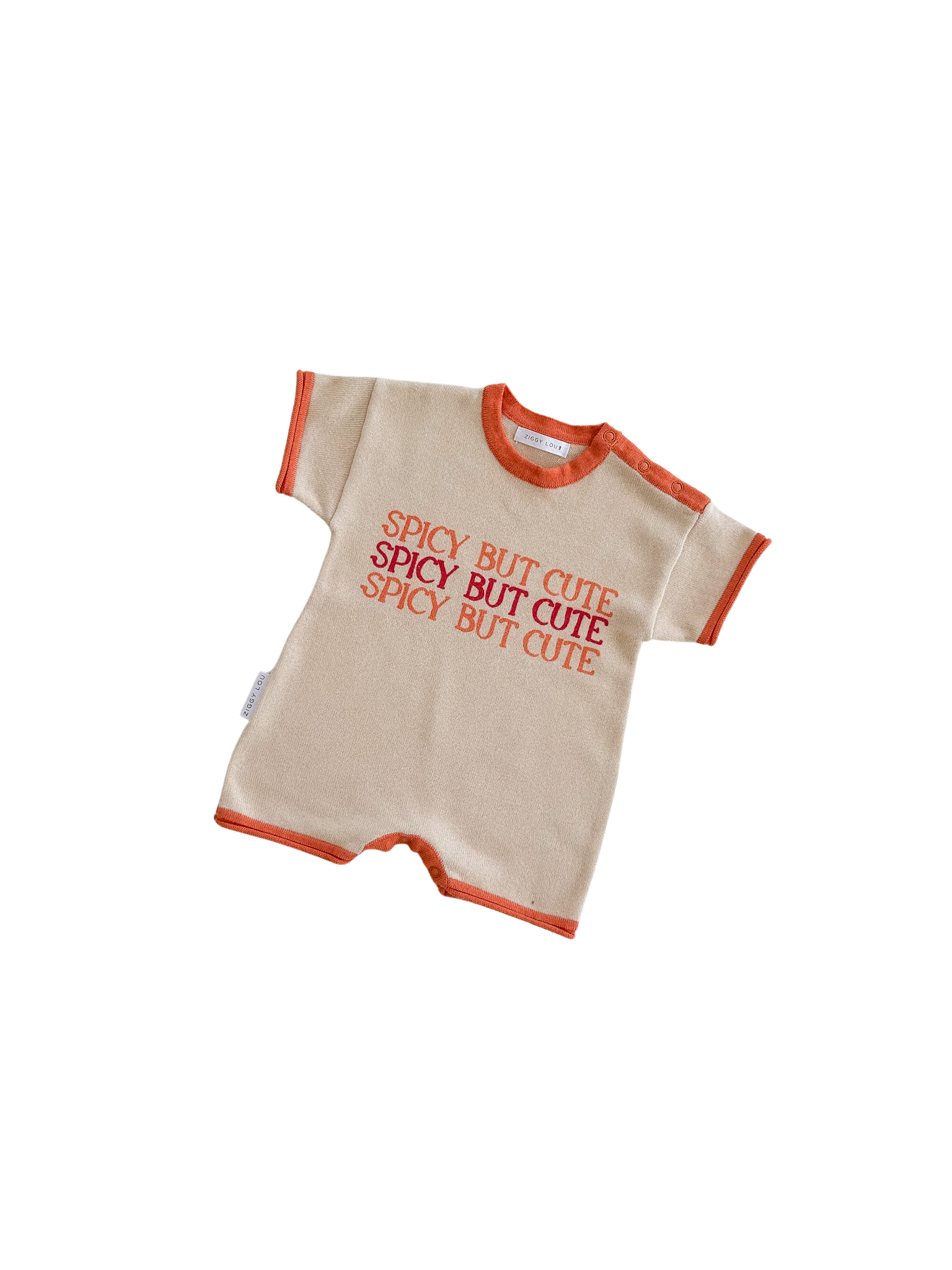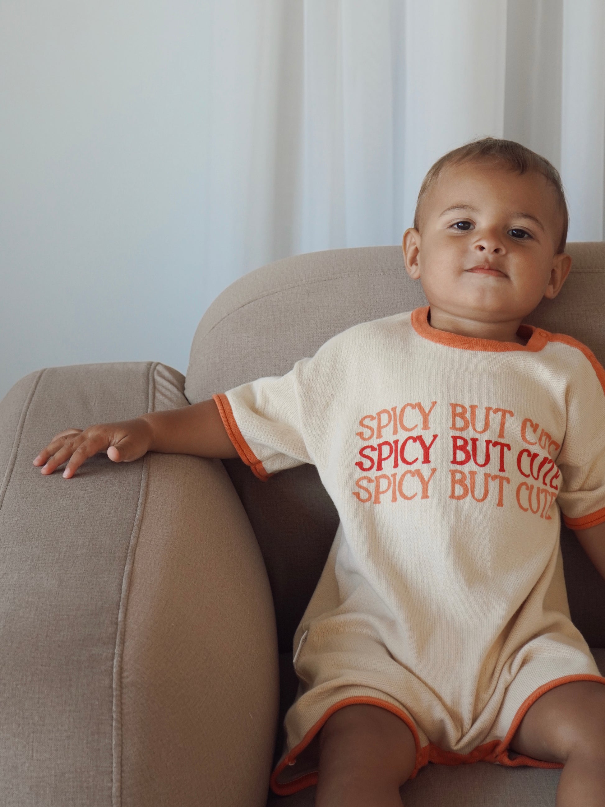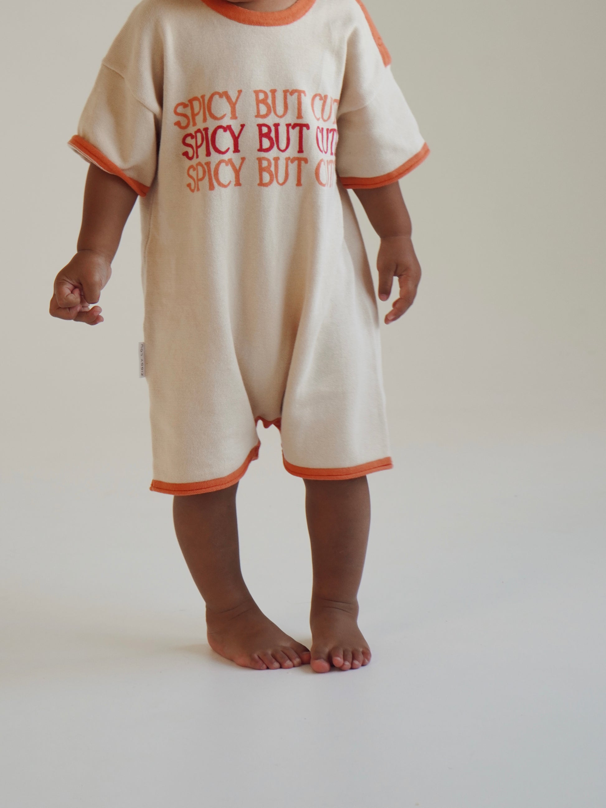 Short sleeve and relaxed fit playsuit featuring our printed Spicy But Cute design. Functional press snaps at crotch for easy nappy changes and press snaps at shoulders for easy on/off.