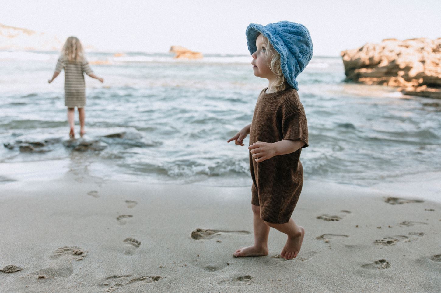 Ribbed playsuit made with a slub 75% cotton 25% linen. This playsuit has a dropped shoulder and press snaps at the crotch for easy dressing. This playsuit has short legs and the fit is oversized for a baggy and relaxed look.