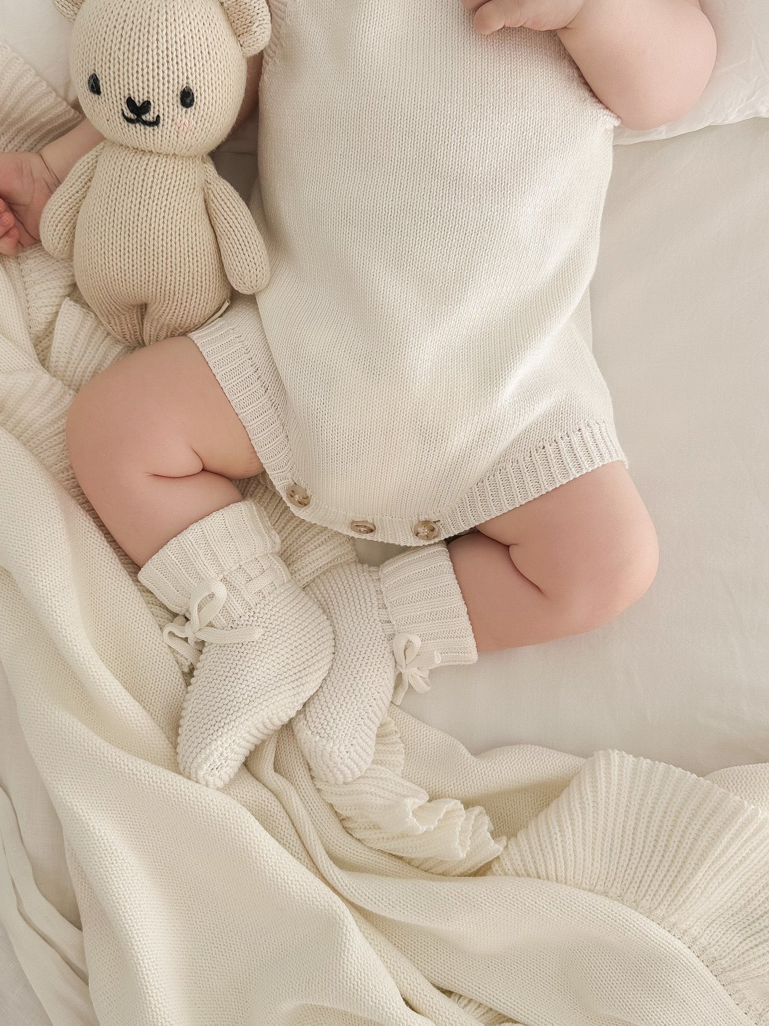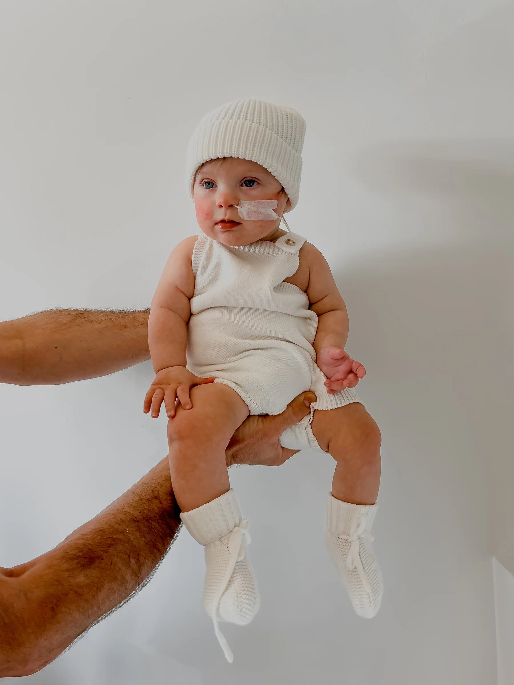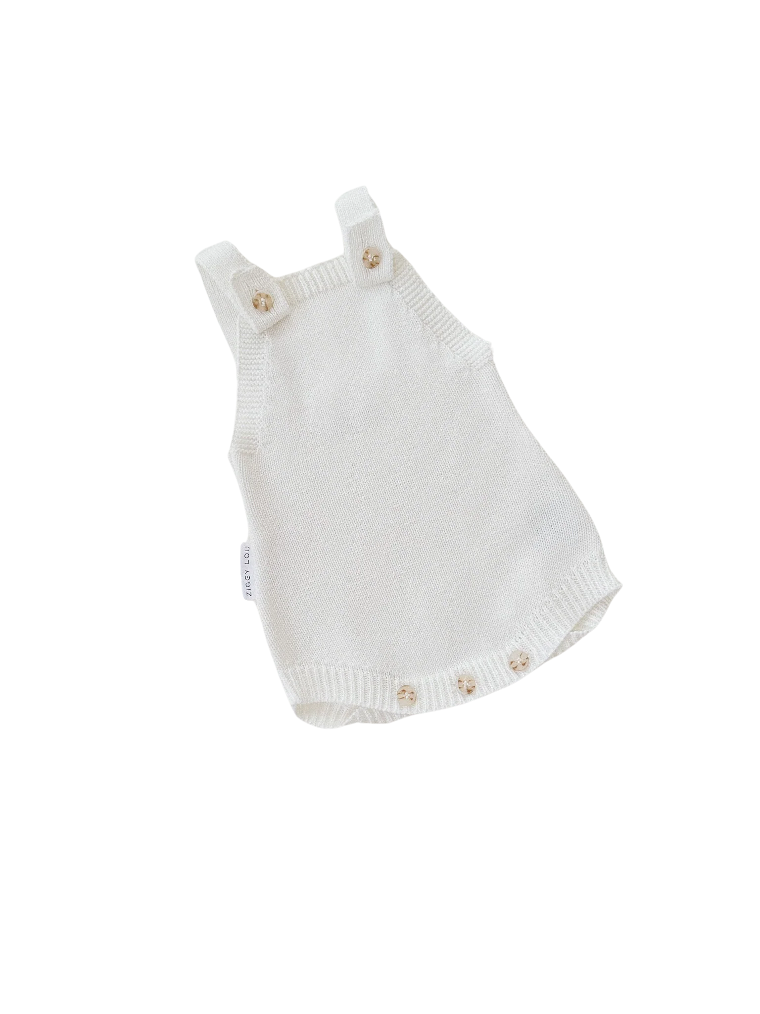 A gorgeous romper in our neutral Milk colour. Buttons at crotch for easy nappy changes and buttons on the front of the shoulder to adjust straps and for easy on/off. Mix and match with items from our Milk Signatures Collection.