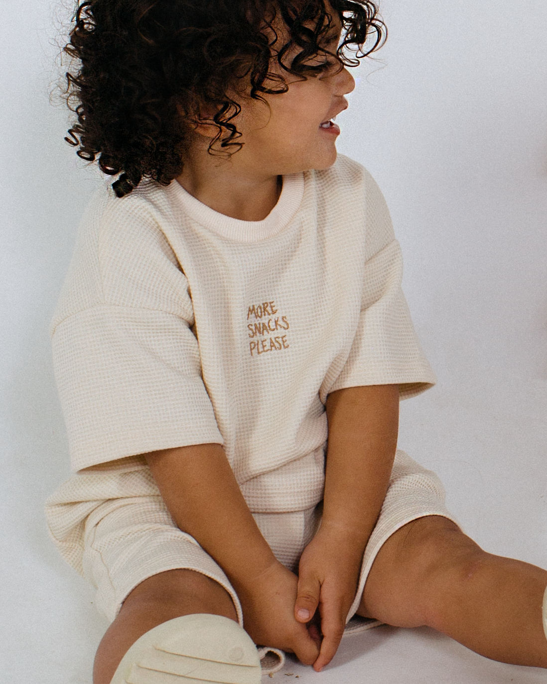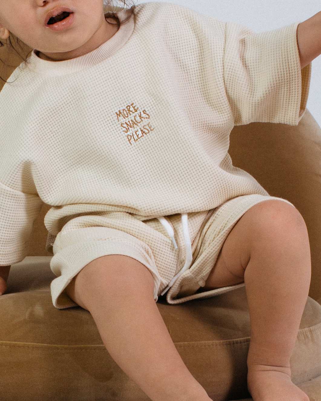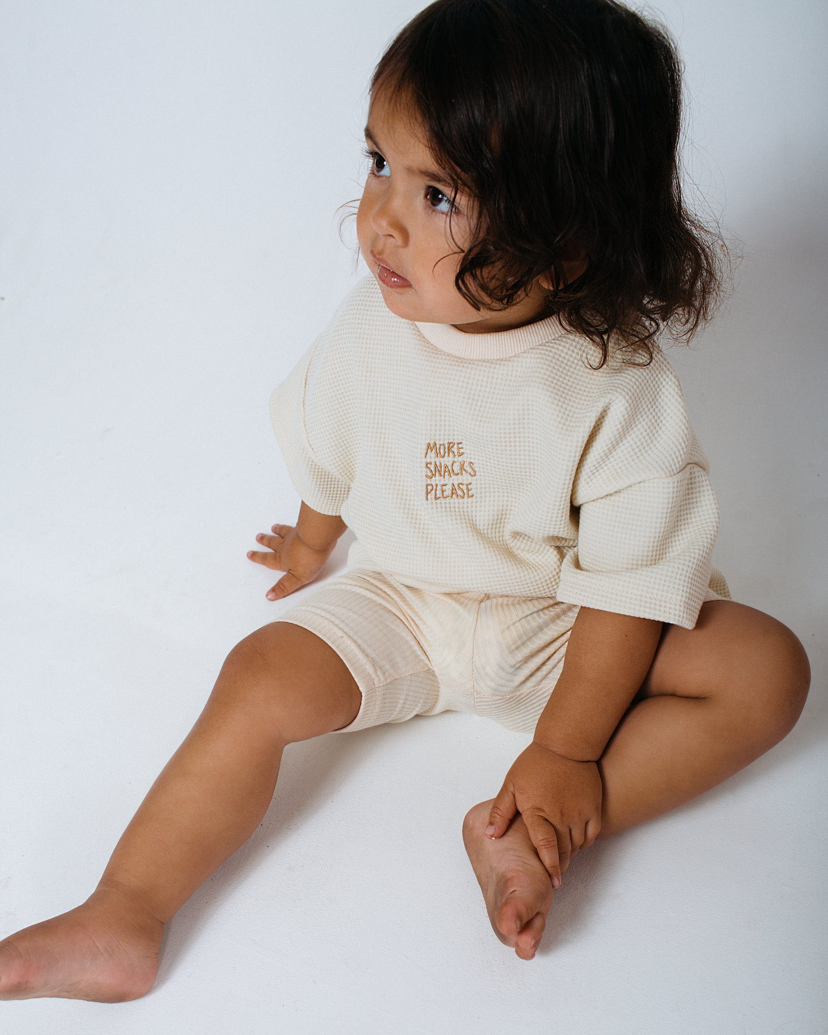 Hold the phone! The softest organic waffle tee in Crumpet has arrived, featuring "More Snacks Please" in gold embroidery—a phrase every mum hears on repeat. This minimal yet cute Spring tee pairs perfectly with the matching Frankie shorts.